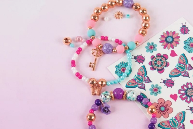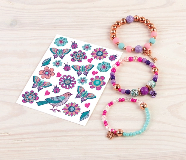 Développe ta créativité et conçois tes propres bracelets fleuris à assortir avec des tatouages temporaires. Grâce aux perles colorées, aux breloques et à l’enfilage simplifié, tu réaliseras en un rien de temps des bijoux qui raviront toutes les petites coquettes.