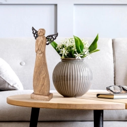 Apportez calme et chaleur à votre maison avec cette élégante figurine d’ange en bois de manguier naturel. Les ailes noires contrastées ajoutent une touche moderne, tandis que le délicat veinage du bois souligne son caractère naturel. L’ange se démarque sur une étagère, une corniche de cheminée ou une table basse et s’intègre facilement aux styles scandinave, moderne ou rustique.