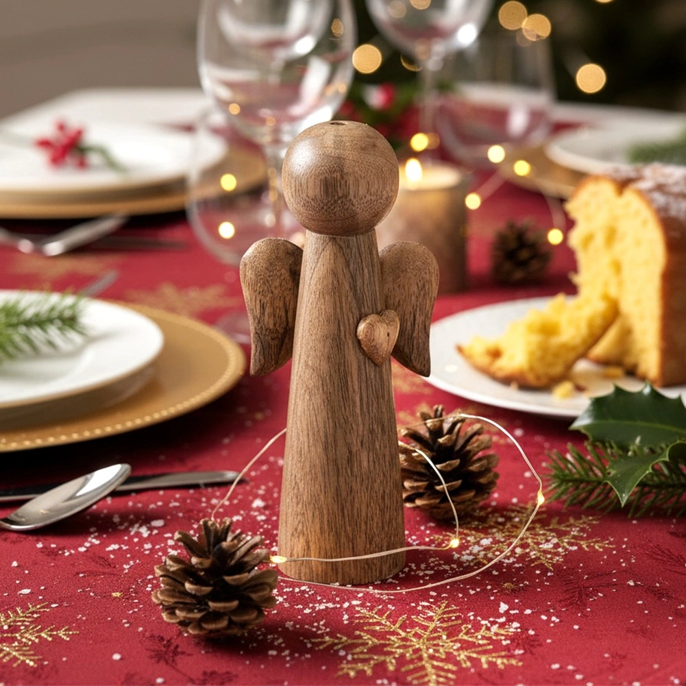 L’ange minimaliste se démarque magnifiquement au centre d’une table de fête, associé à des branches, des bougies et une décoration hivernale.