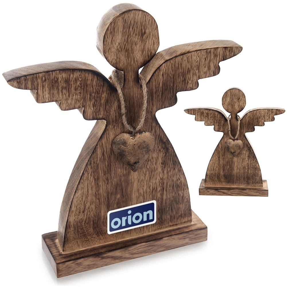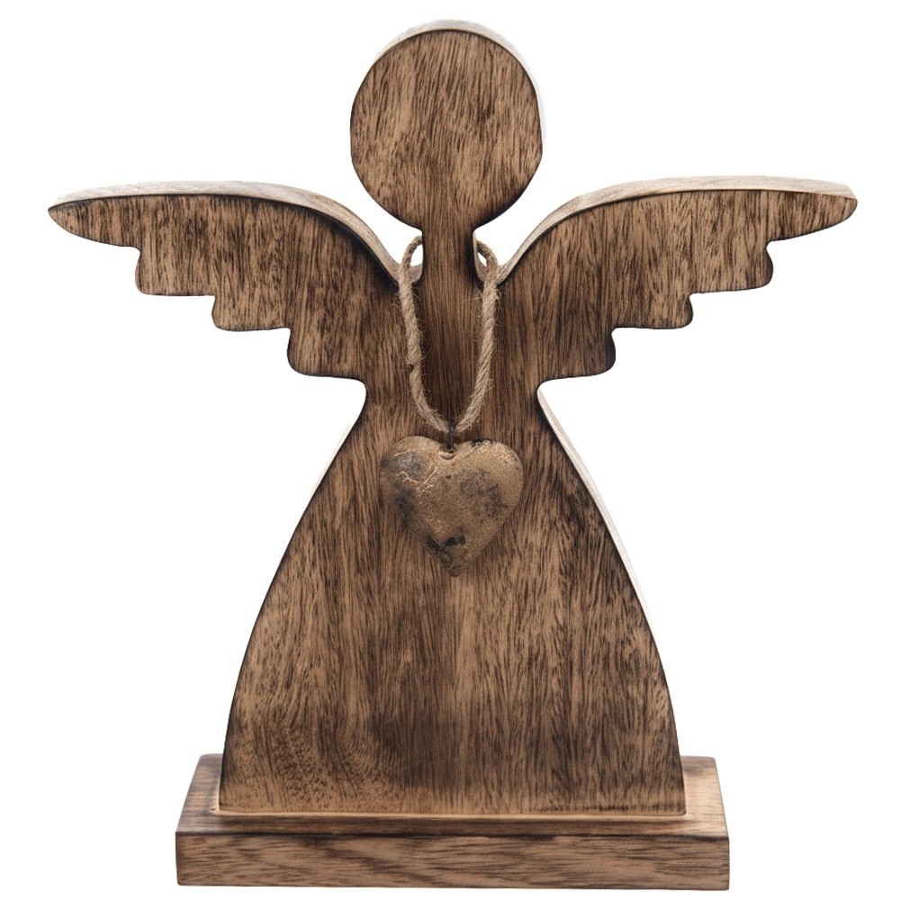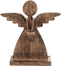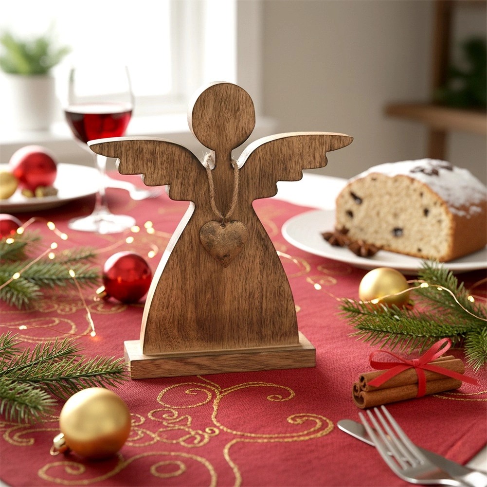 Élégante figurine d’ange en bois de manguier avec un cœur suspendu dans une teinte dorée, une décoration d’intérieur raffinée. Son aspect naturel et son socle solide la mettent en valeur sur une étagère, une commode ou une table de fête. Ornement universel pour toute l’année et superbe idée cadeau.