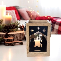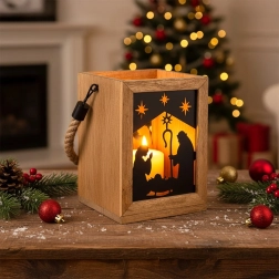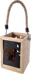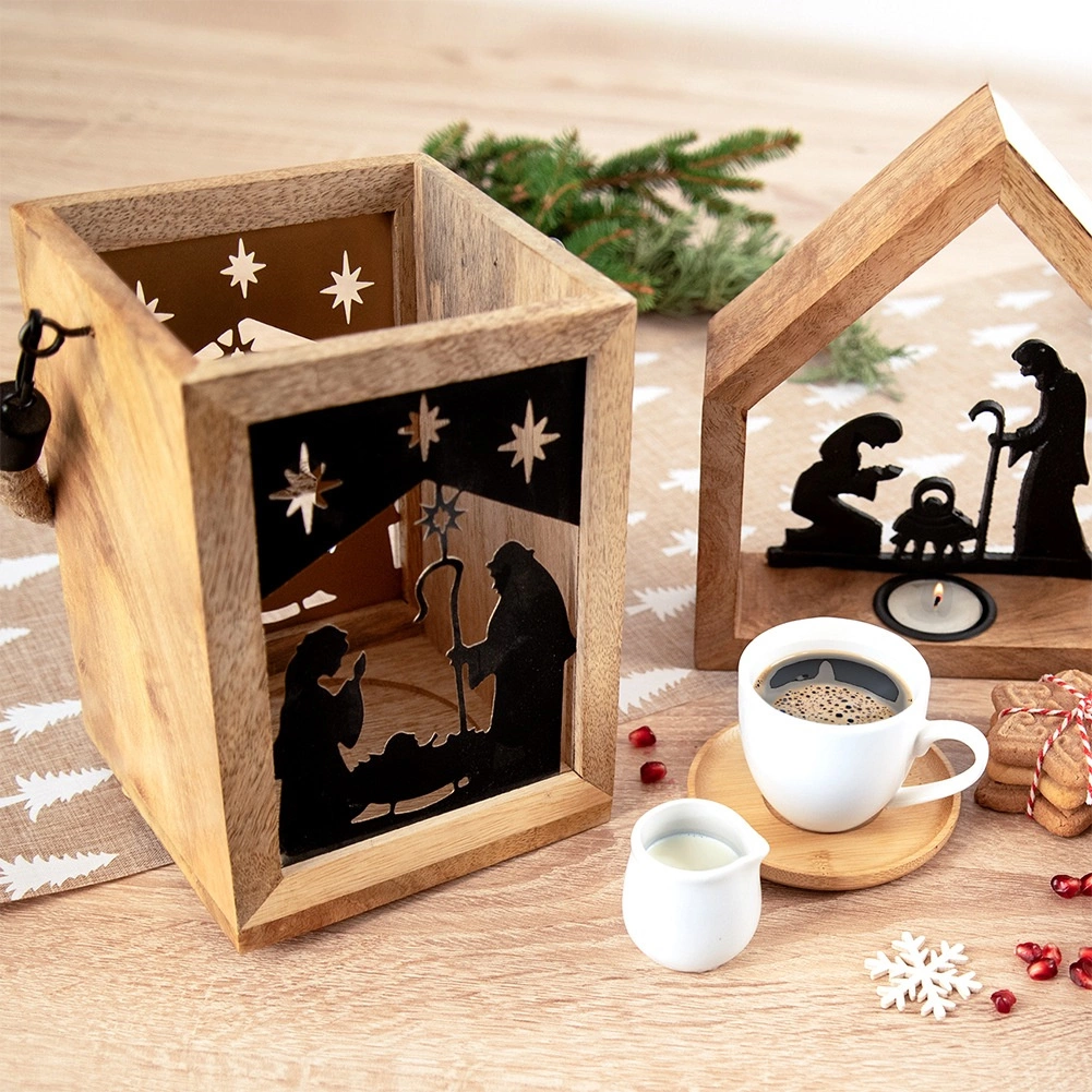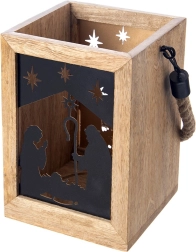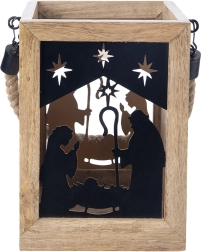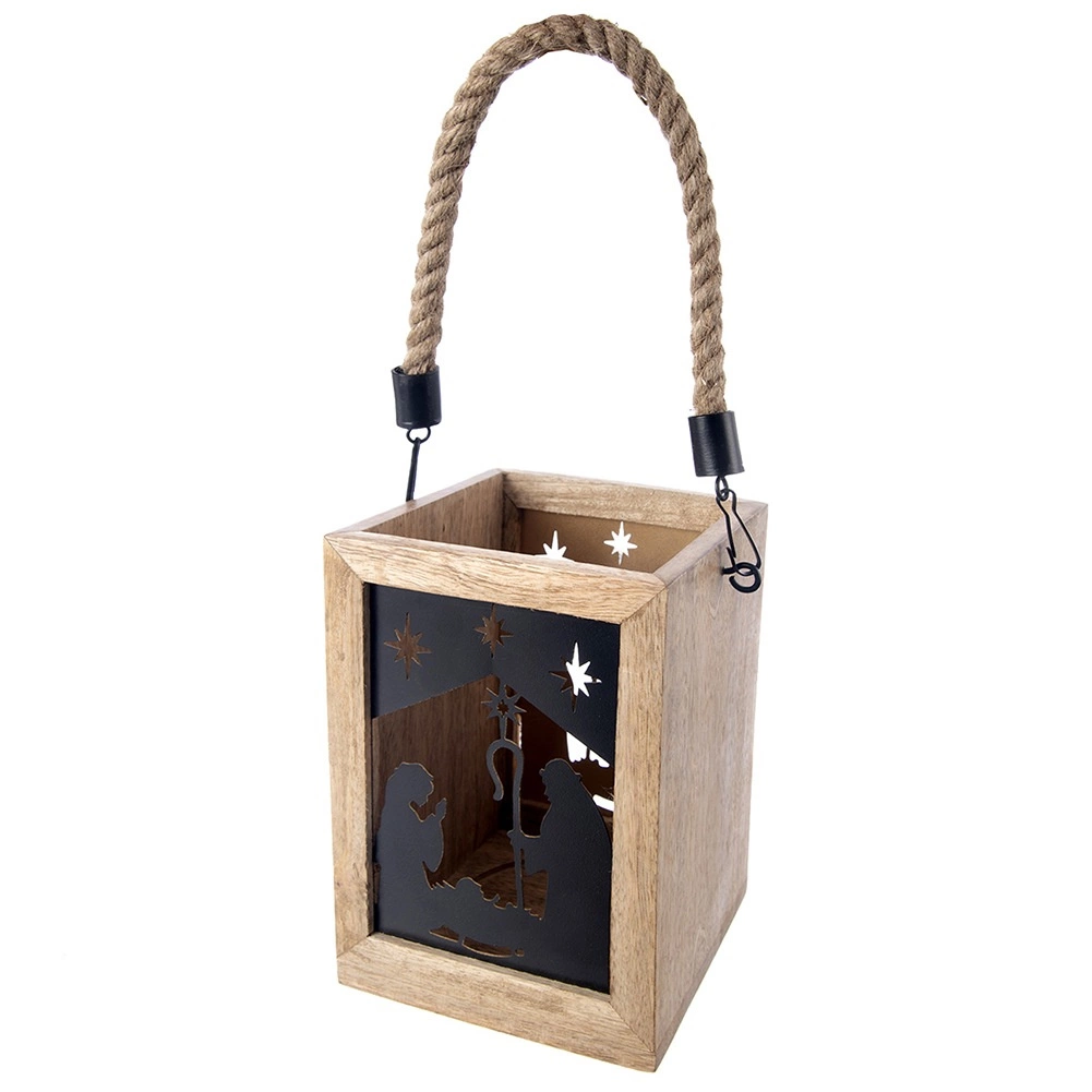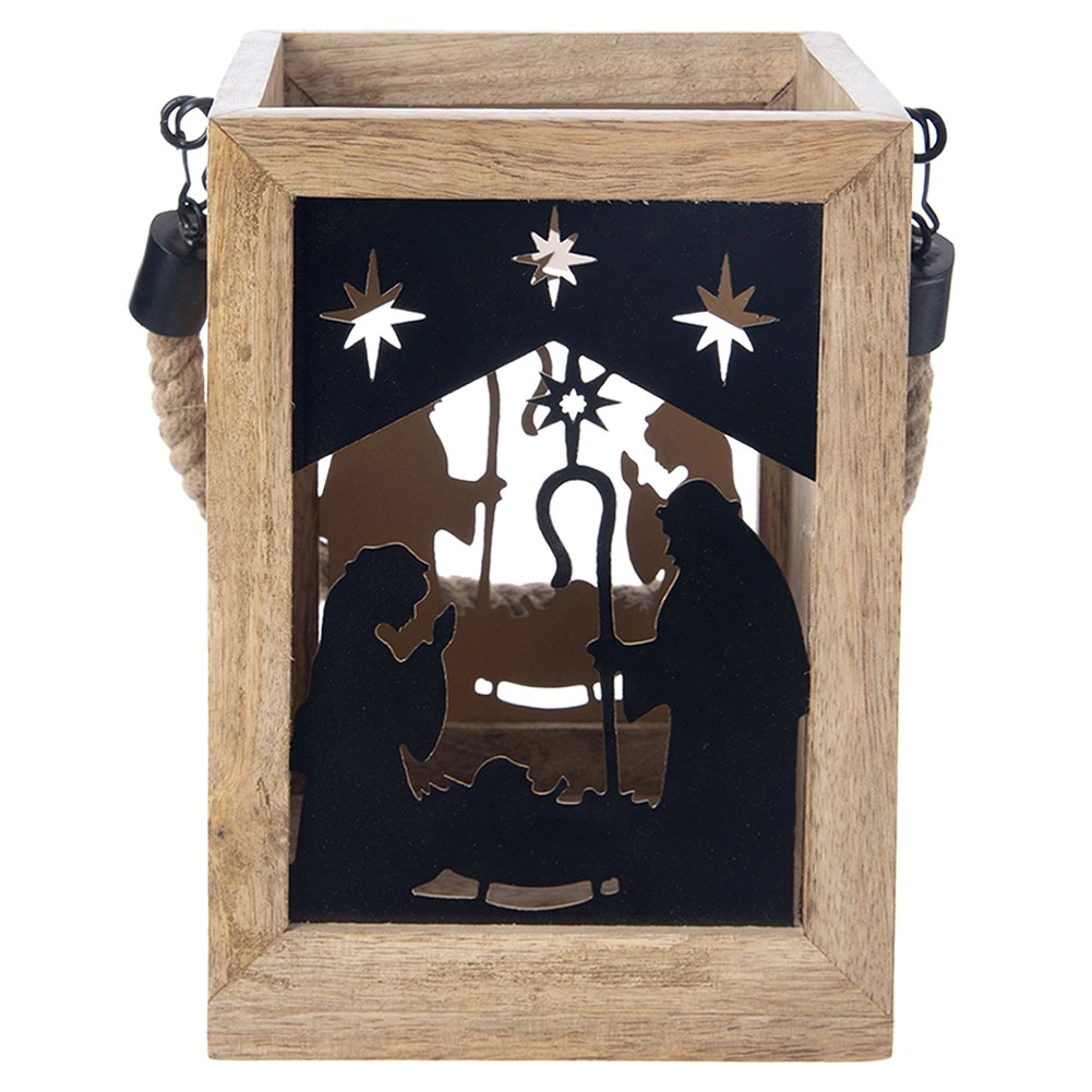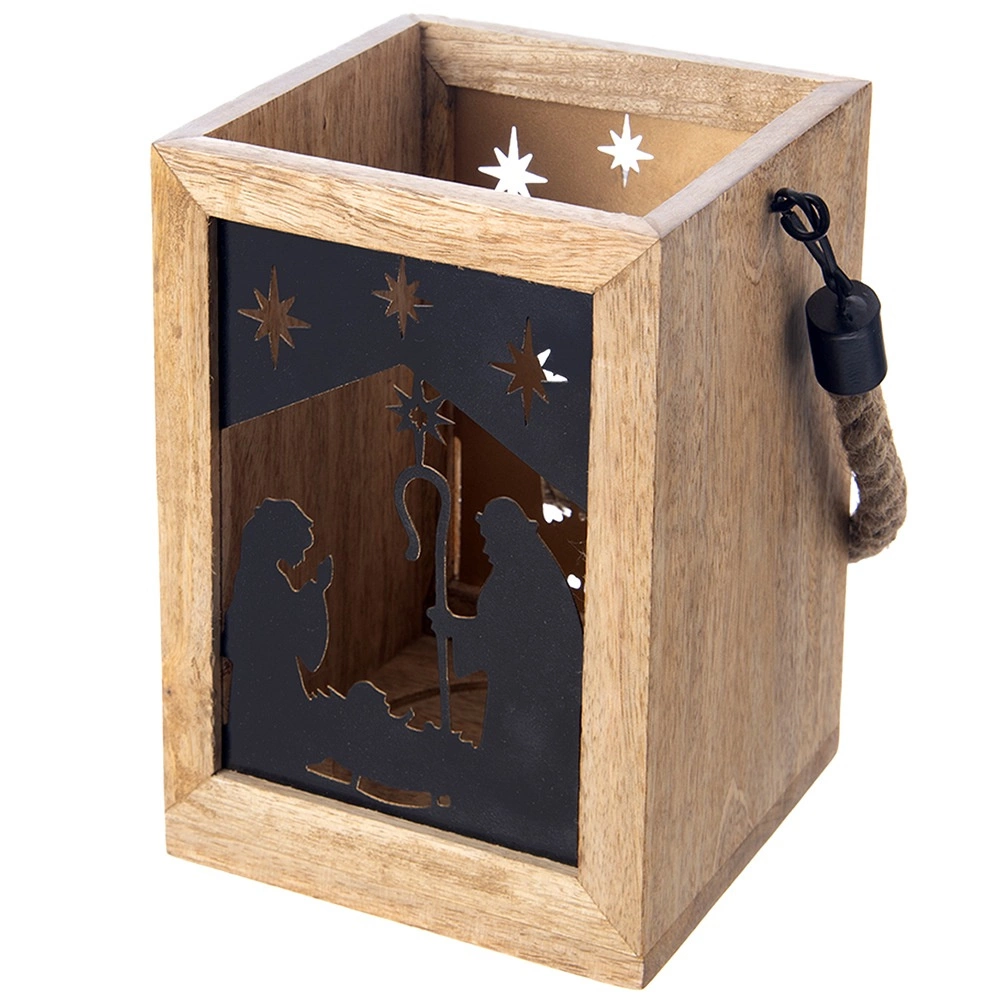 Apportez la magie de Noël à votre maison avec cette lanterne en bois de manguier de 14 × 14 × 20 cm. Les panneaux métalliques noirs au motif de la Sainte Famille et des étoiles laissent filtrer une lumière chaude et créent de ravissantes projections lumineuses. La lanterne est conçue pour être posée sur une commode, une table ou au sol, mais peut également être suspendue grâce à sa corde tressée robuste.