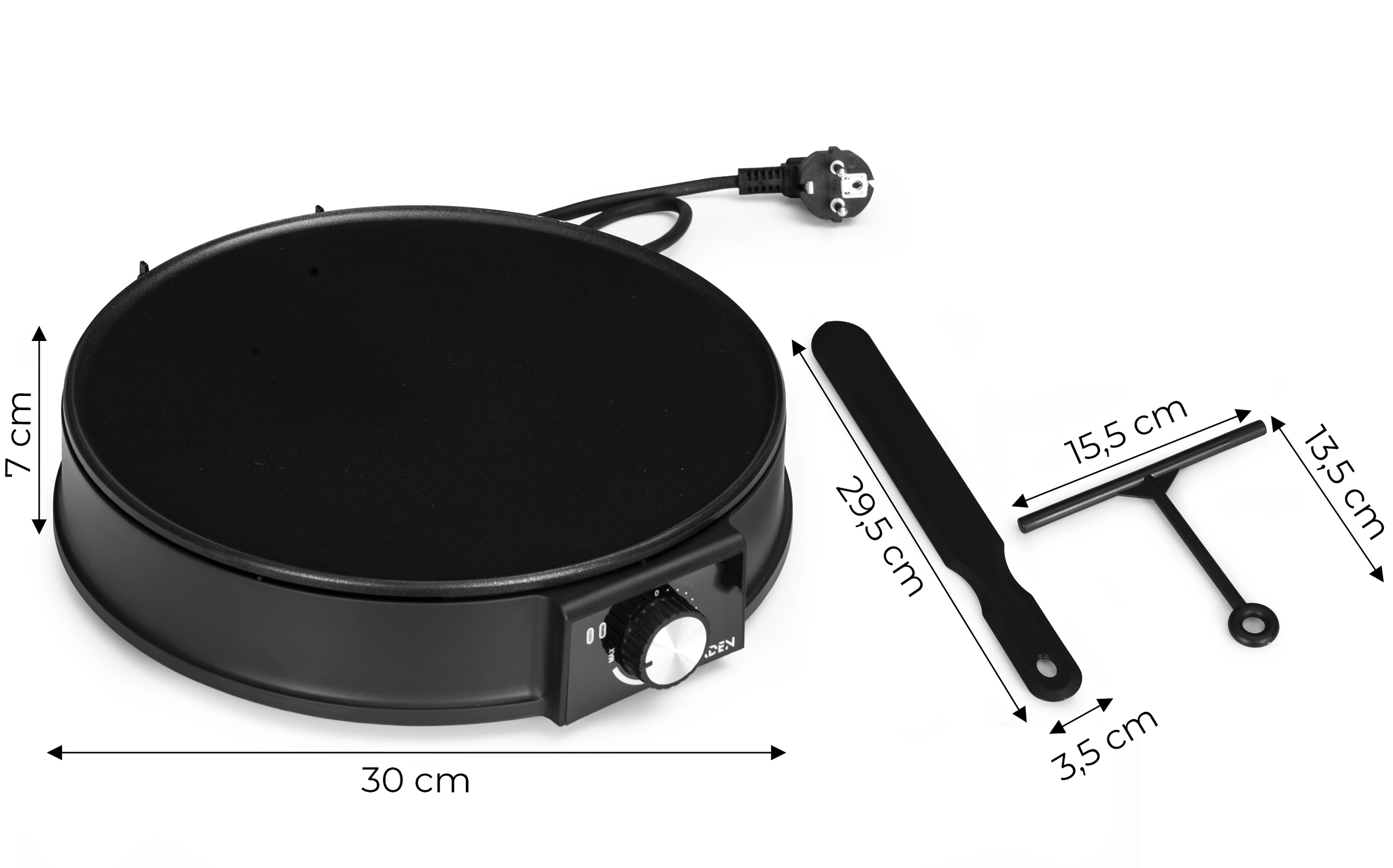 Le diamètre de 30 cm offre suffisamment d’espace pour de grandes crêpes. Le coffret inclut une spatule et un râteau en T pour étaler la pâte comme un pro.