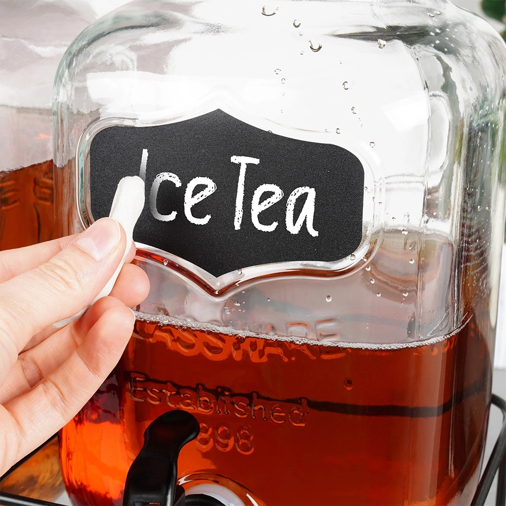 Ce set pratique de deux distributeurs de boissons apporte ordre et style à chaque service. Chaque bocal en verre a une capacité de 4 l et est équipé d’un robinet en plastique avec joint pour un versement fluide. Grâce au large goulot, le remplissage avec des fruits ou des glaçons est facile, le couvercle protège la boisson des insectes et des impuretés. Une surface ardoise à l’avant permet de noter à la craie.