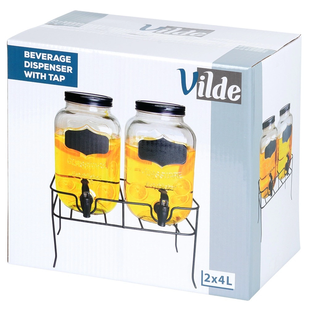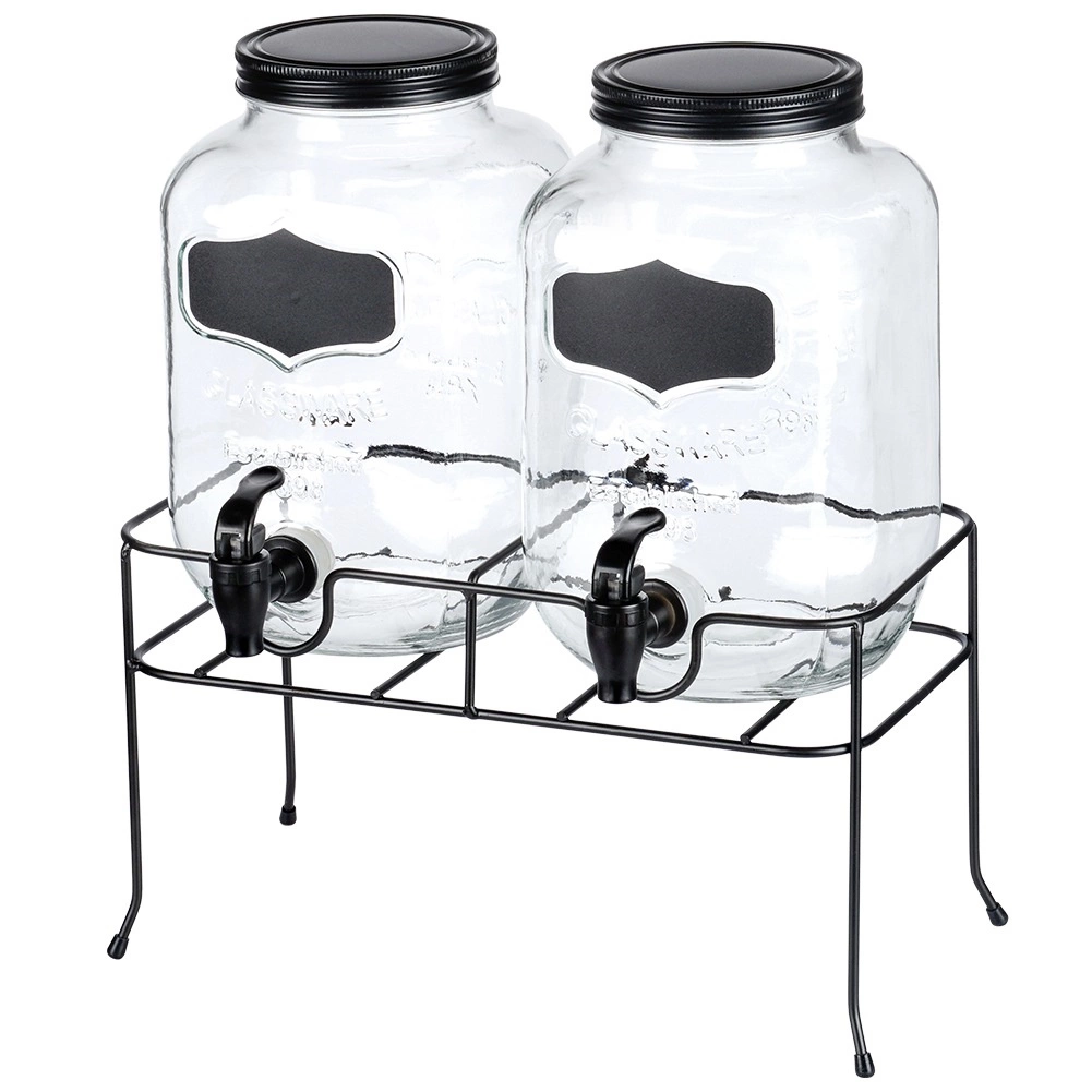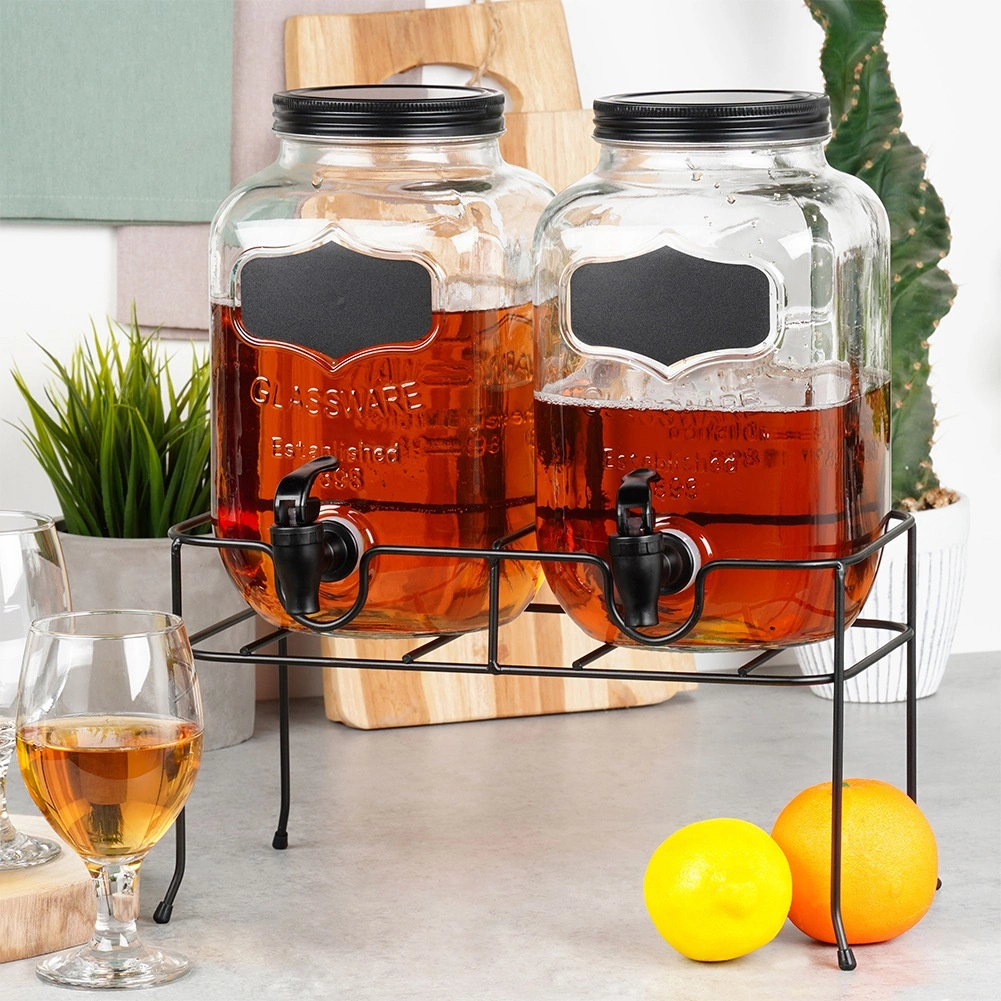 Le support métallique noir robuste assure une hauteur idéale pour un tirage confortable et possède des pieds caoutchoutés contre le glissement et les rayures sur le plan de travail. Le set est parfait pour limonades, jus, thé glacé, eau aromatisée ou punch lors des fêtes de famille, barbecues et même en restauration, où il permet de présenter élégamment deux boissons différentes.