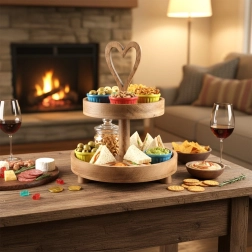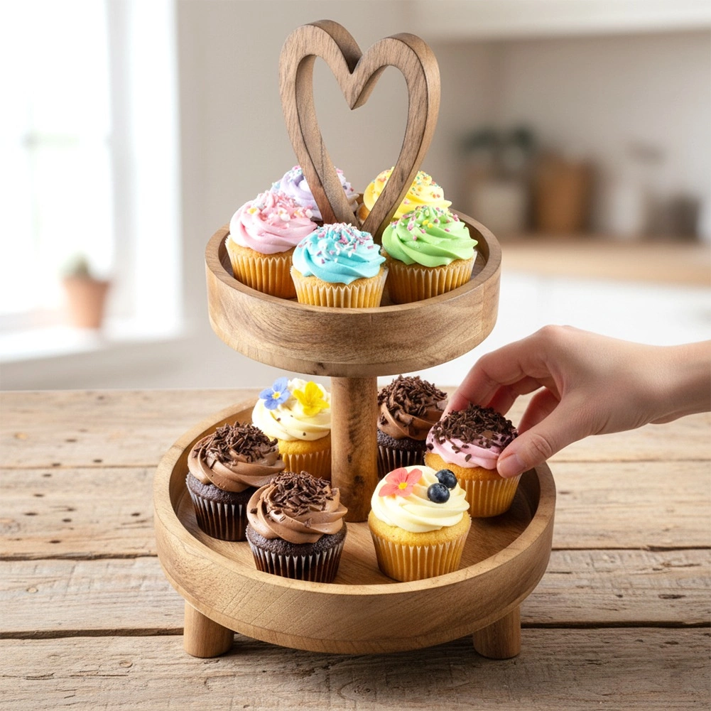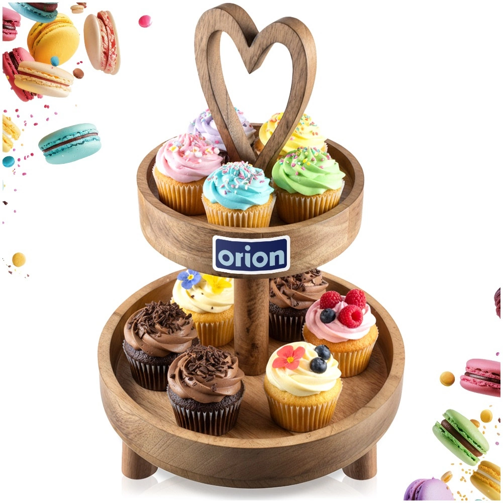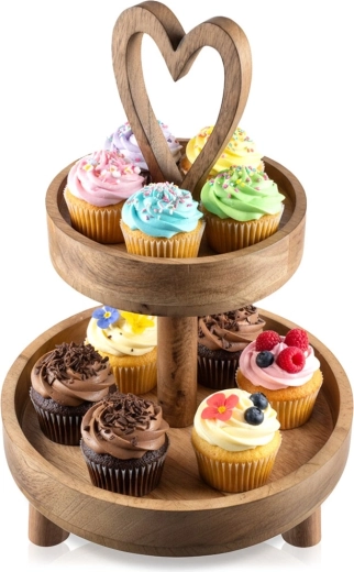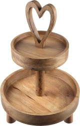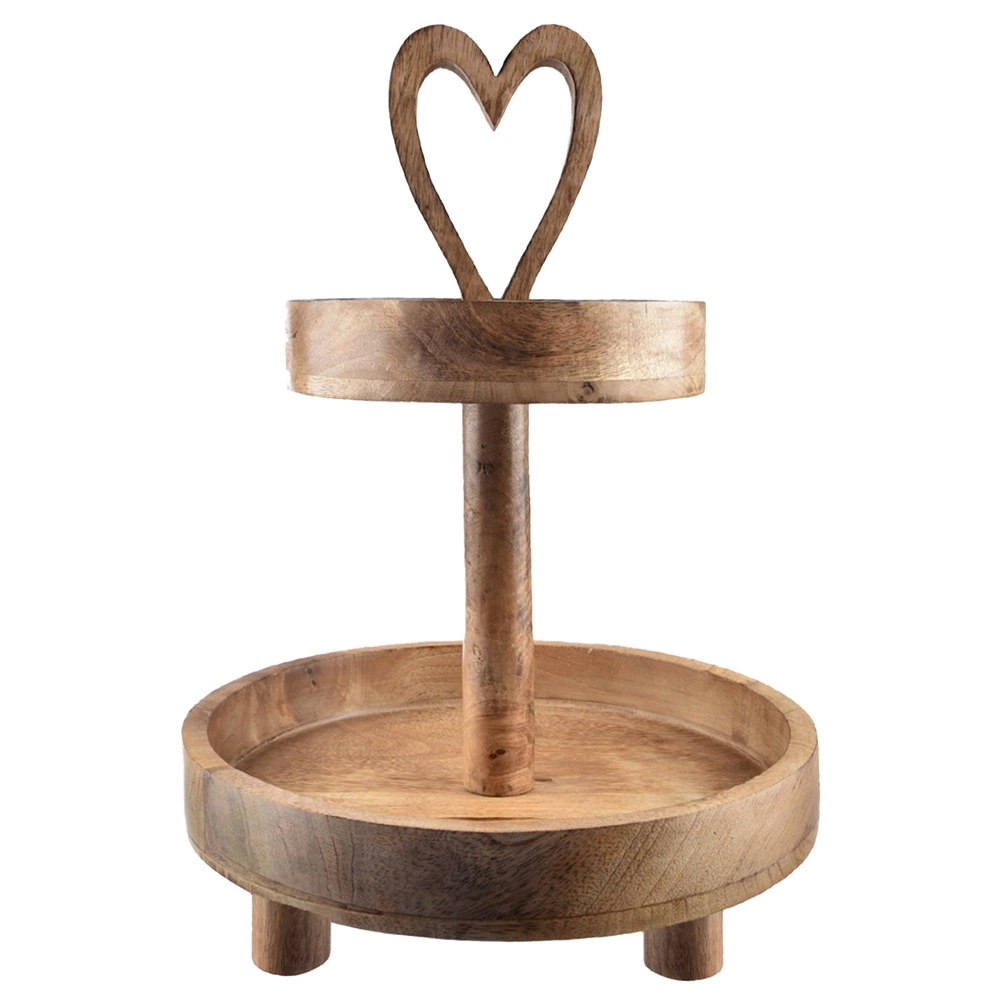 Élégante étagère à deux niveaux en bois de manguier d’une hauteur de 42 cm, idéale pour le service et la présentation de desserts, friandises aux fruits et bouchées salées. Le bois de manguier naturel est résistant à l’humidité et stable, les bords relevés des plateaux empêchent le glissement et la poignée en forme de cœur facilite le transport.