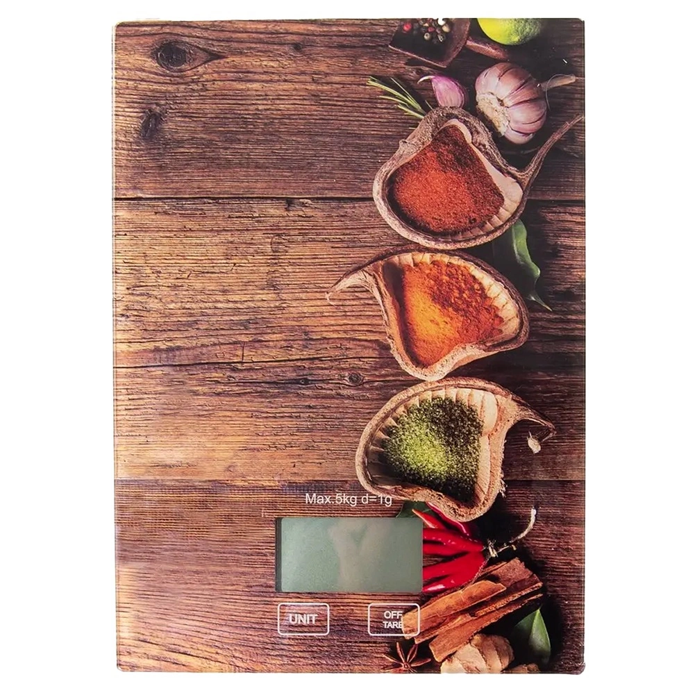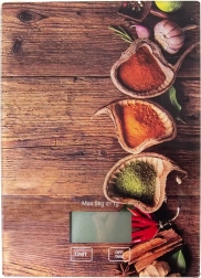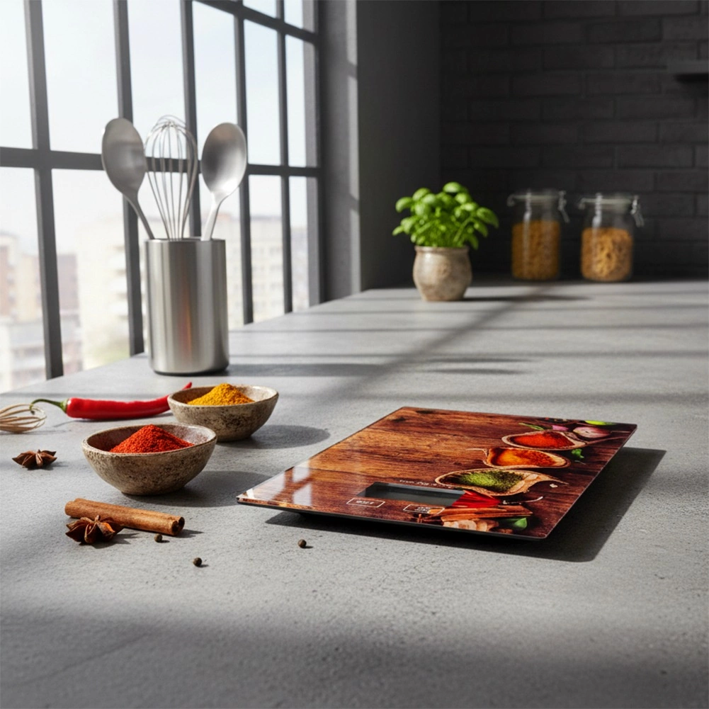 La balance s’éteint automatiquement en cas d’inactivité, signale faible niveau de batterie et surcharge, et reste ainsi toujours prête à l’emploi. Les pieds antidérapants maintiennent l’appareil bien en place. Le verre lisse se nettoie facilement et le motif moderne d’épices apporte du style au plan de travail.