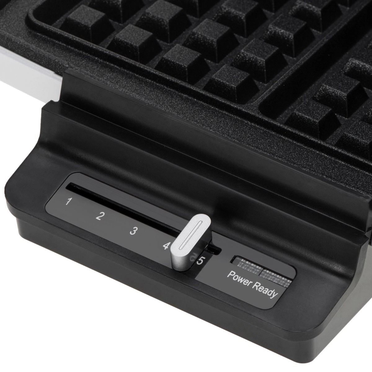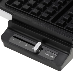 Le curseur à 5 niveaux (1–5) vous permet de choisir précisément le degré de cuisson – de gaufres moelleuses à des gaufres bien croustillantes. Les voyants Power et Ready facilitent le minutage.