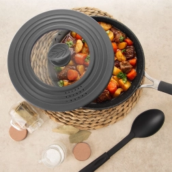 Le bord en silicone protège les bords des récipients et assure une bonne étanchéité, tandis que le centre en verre permet de surveiller la cuisson sans soulever le couvercle.