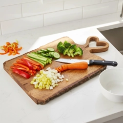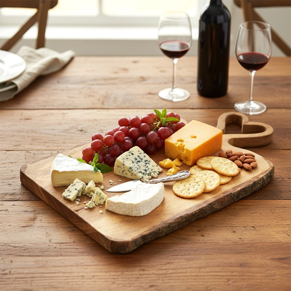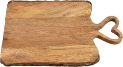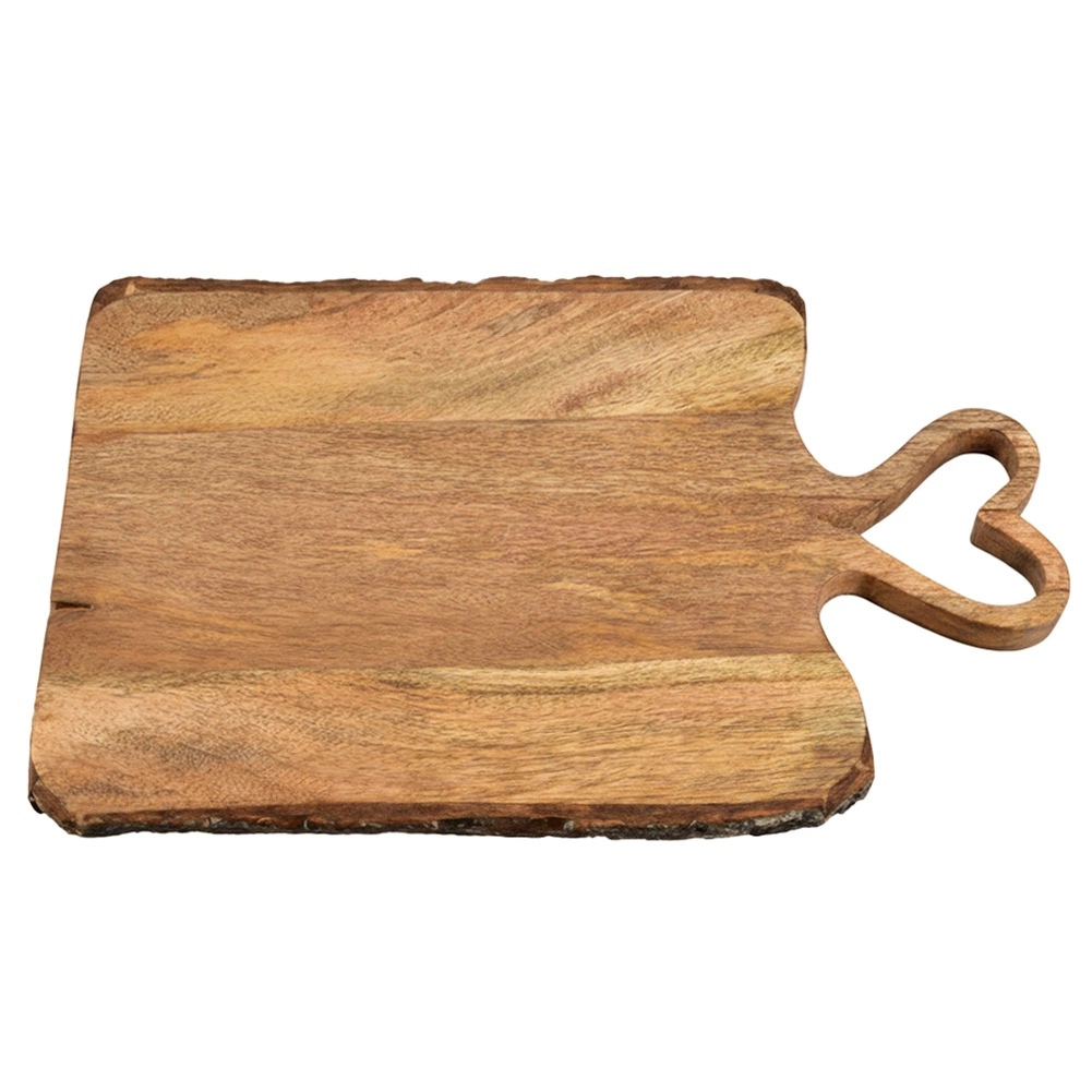 Élégante planche en bois de manguier avec une poignée en forme de cœur, idéale pour découper et servir fromages, charcuteries et snacks. Dimensions 45 × 25 × 2 cm, structure robuste, résistante à l’humidité et aux odeurs. Produit original de la marque ORION.