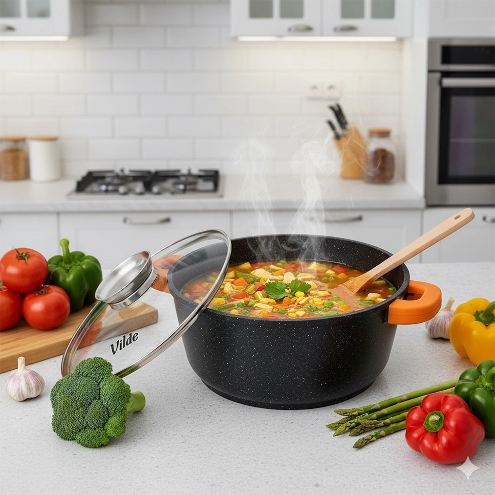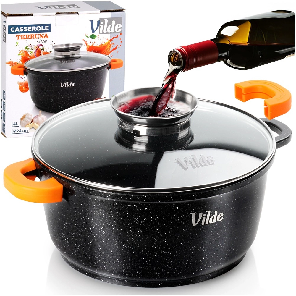 Découvrez la casserole pratique VILDE de la ligne TERRUNA AROMA, qui associe un corps moulé en aluminium résistant à une couche granit antiadhésive pour une cuisson plus saine. Le couvercle en verre avec large poignée en inox et doseur permet d’ajouter du vin, de l’eau ou du bouillon sans soulever le couvercle, afin de préserver la température et les arômes du plat.