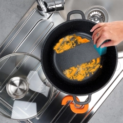 Les manchons en silicone antidérapants protègent les mains et assurent une prise ferme. Le fond convient à tous les types de plaques, y compris l’induction.