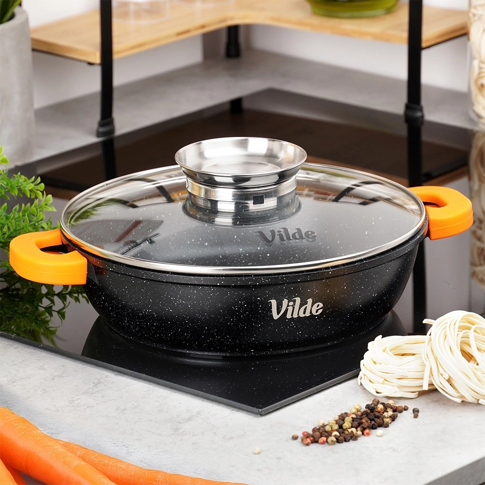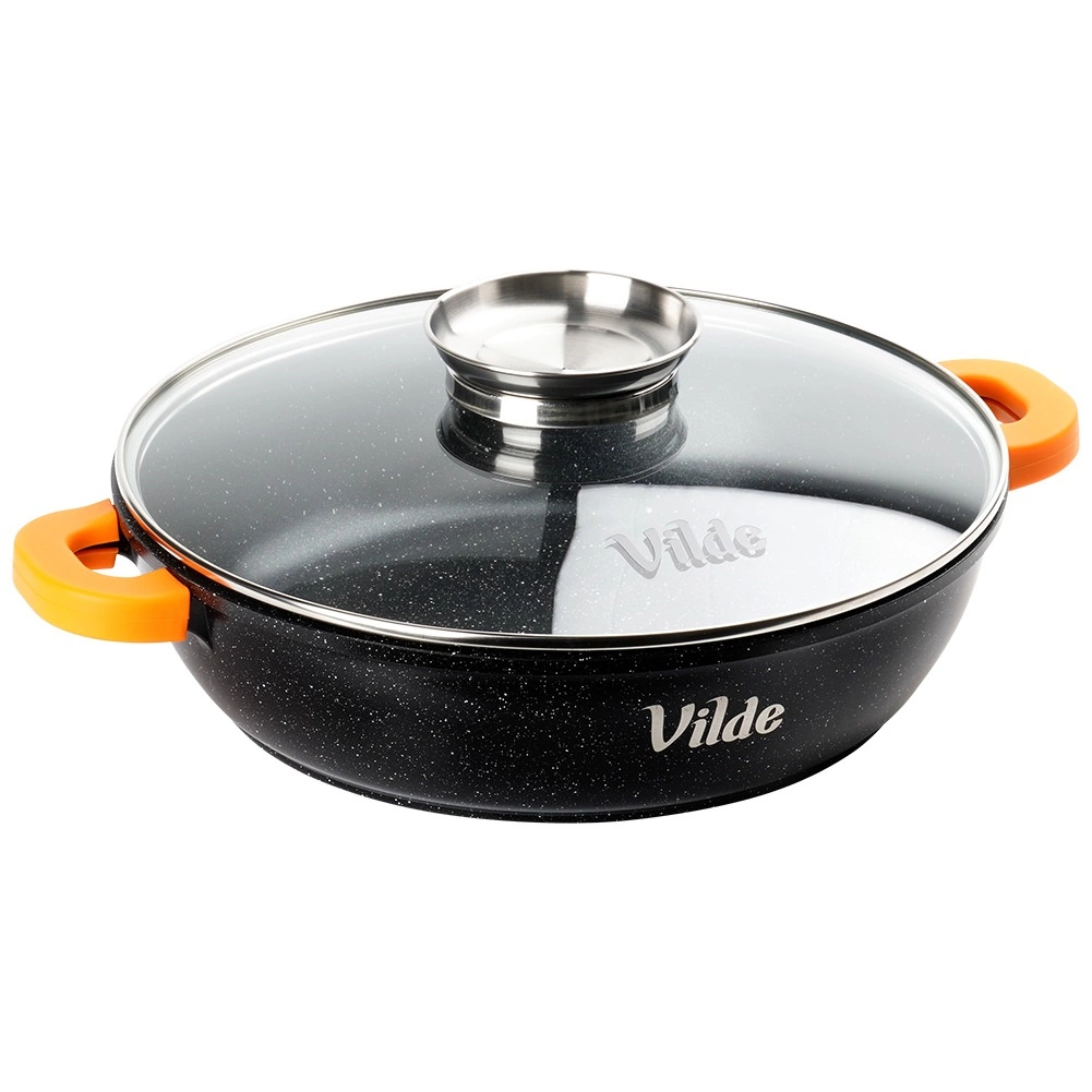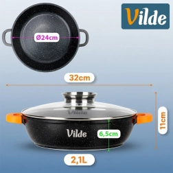 La poêle profonde TERRUNA AROMA 24 cm est une solution universelle pour la cuisine au quotidien – de la cuisson rapide à la poêle au mijotage jusqu’au gratin. Le corps en aluminium robuste avec revêtement granit antiadhésif assure une distribution homogène de la chaleur et un démoulage facile des mets. Le couvercle en verre avec poignée en acier inoxydable et doseur intégré permet d’ajouter eau, vin ou sauces sans soulever le couvercle.