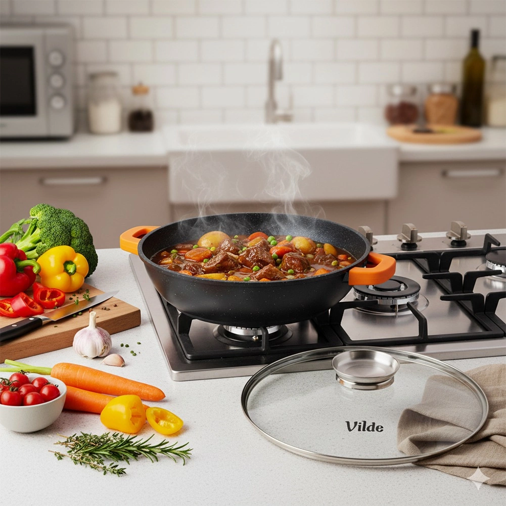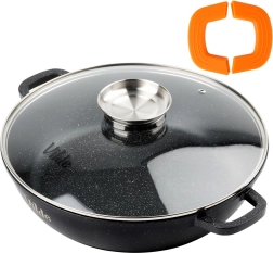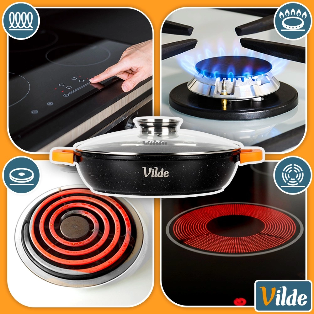 Le corps massif en aluminium coulé avec revêtement granit antiadhésif assure une diffusion homogène de la chaleur et un nettoyage facile. Deux poignées robustes avec manchons en silicone antidérapants offrent une prise sûre même à haute température. La poêle est compatible avec les plaques au gaz, électriques, vitrocéramiques et à induction, et peut aussi être utilisée au four jusqu’à 200 °C (sans le couvercle). Compatible lave-vaisselle.