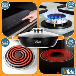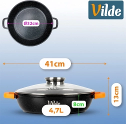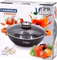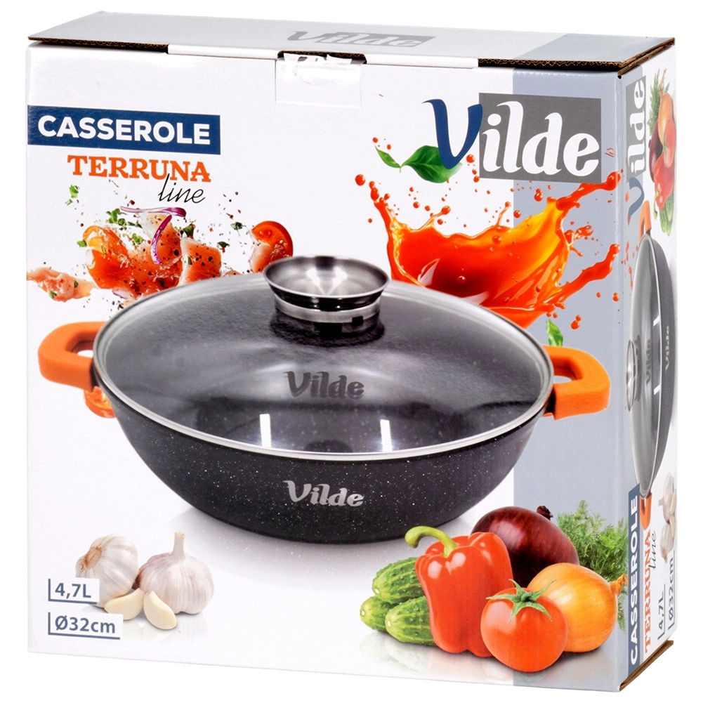 Contenu de l’emballage : poêle 32 cm, couvercle en verre avec doseur, manchons en silicone orange pour poignées. Produit original de la marque Vilde – ligne TERRUNA AROMA, fabriqué conformément aux normes européennes.