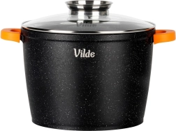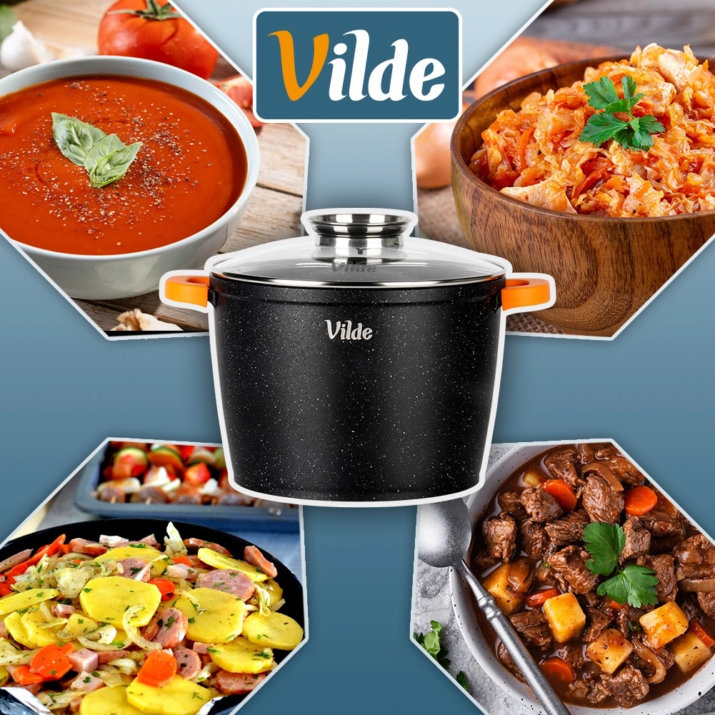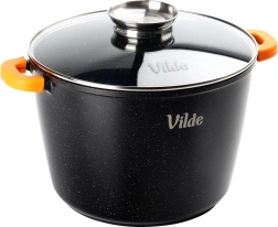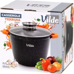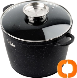 Grand faitout en granit Vilde TERRUNA AROMA d’une capacité de 6,7 l et de 24 cm de diamètre, idéal pour les soups, goulaschs et braisages. Grâce au revêtement granit antiadhésif, vous cuisinez avec un minimum de matière grasse ; le couvercle en verre avec doseur permet d’ajouter des liquides sans soulever le couvercle, et les manchons en silicone antidérapants sur les poignées assurent une prise en main sûre. Compatible gaz, électrique, vitrocéramique et induction, au four jusqu’à 200 °C (sans couvercle) et au lave-vaisselle.