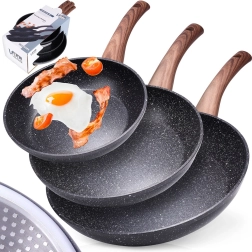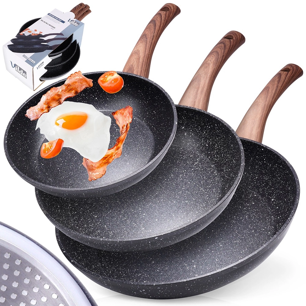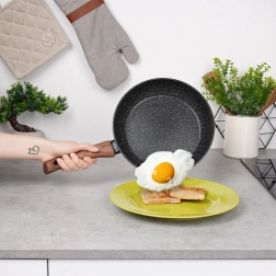 Le set de poêles BLACK&WOOD allie look moderne et praticité pour toutes les cuisines. Trois tailles polyvalentes (20/24/28 cm) couvrent les petits-déjeuners rapides, les déjeuners et les dîners familiaux. Le revêtement antiadhésif en granit durable assure un démoulage fluide des plats, moins d’adhérence et un entretien simplifié.