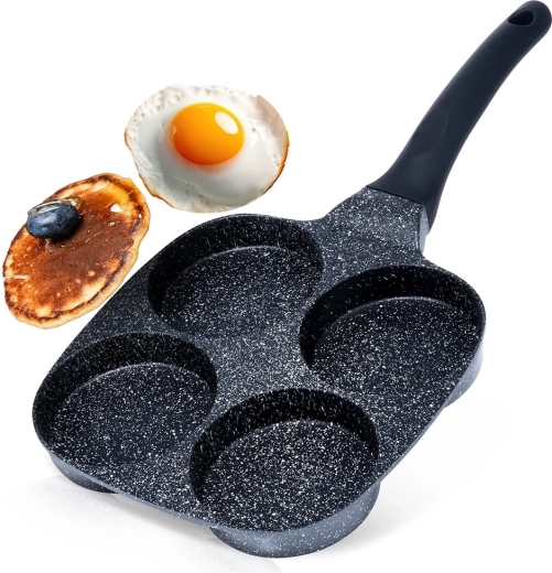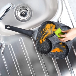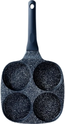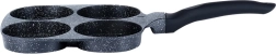 Poêle en granit pratique avec quatre moules ronds de 8,5 cm de diamètre pour des œufs et des pancakes parfaitement formés. Grâce au revêtement granit antiadhésif, vous cuisinez avec un minimum de matière grasse, la répartition uniforme de la chaleur garantit une cuisson homogène et la poignée ergonomique assure une utilisation sûre et confortable. Compatible avec tous les types de plaques, y compris l’induction, et facile à nettoyer.