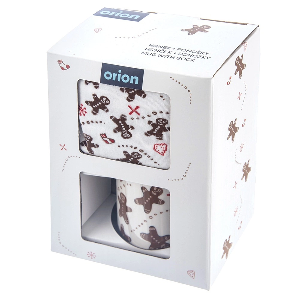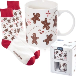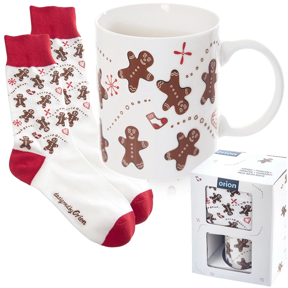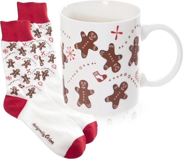 Coffret cadeau élégant au motif de petits bonshommes en pain d’épice : mug en céramique d’une capacité de 350 ml et chaussettes douces (taille 38–40). À la fois pratique et décoratif, idéal pour les soirées d’hiver avec café ou cacao. Le mug possède une anse classique, passe au micro-ondes, les chaussettes se lavent à 30 °C.