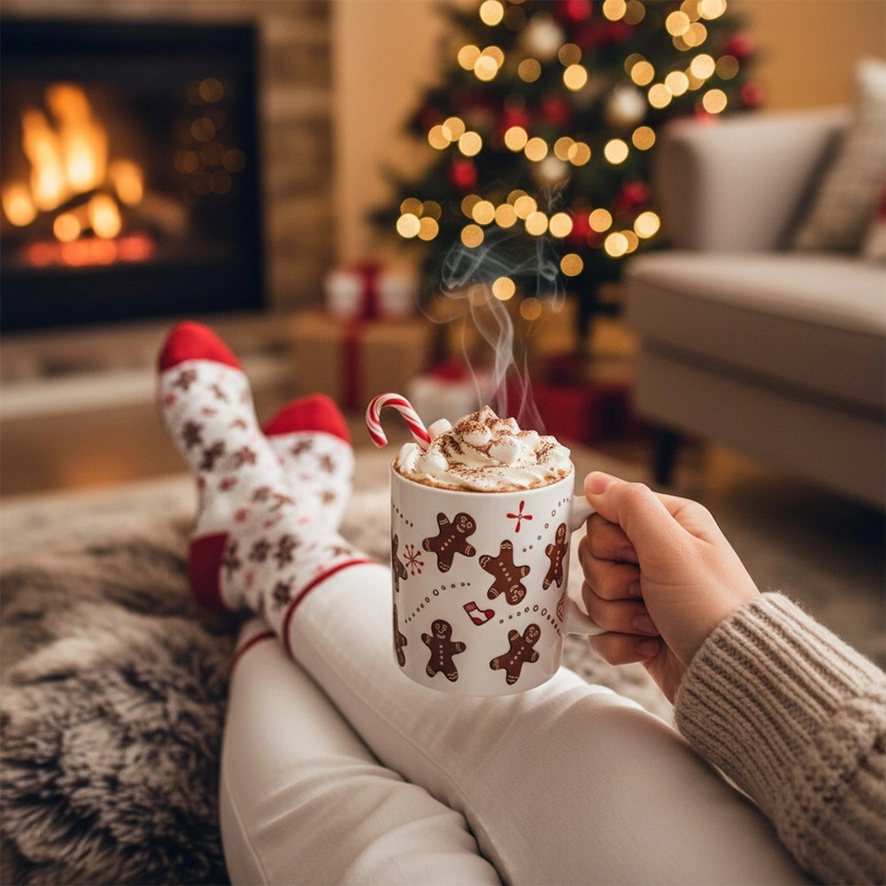 Un mug pour boissons chaudes et des chaussettes moelleuses au motif pain d’épice forment un duo parfait pour les soirées film ou la détente au coin du feu.