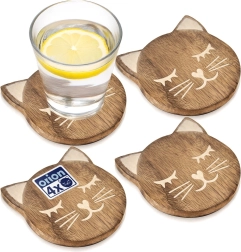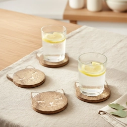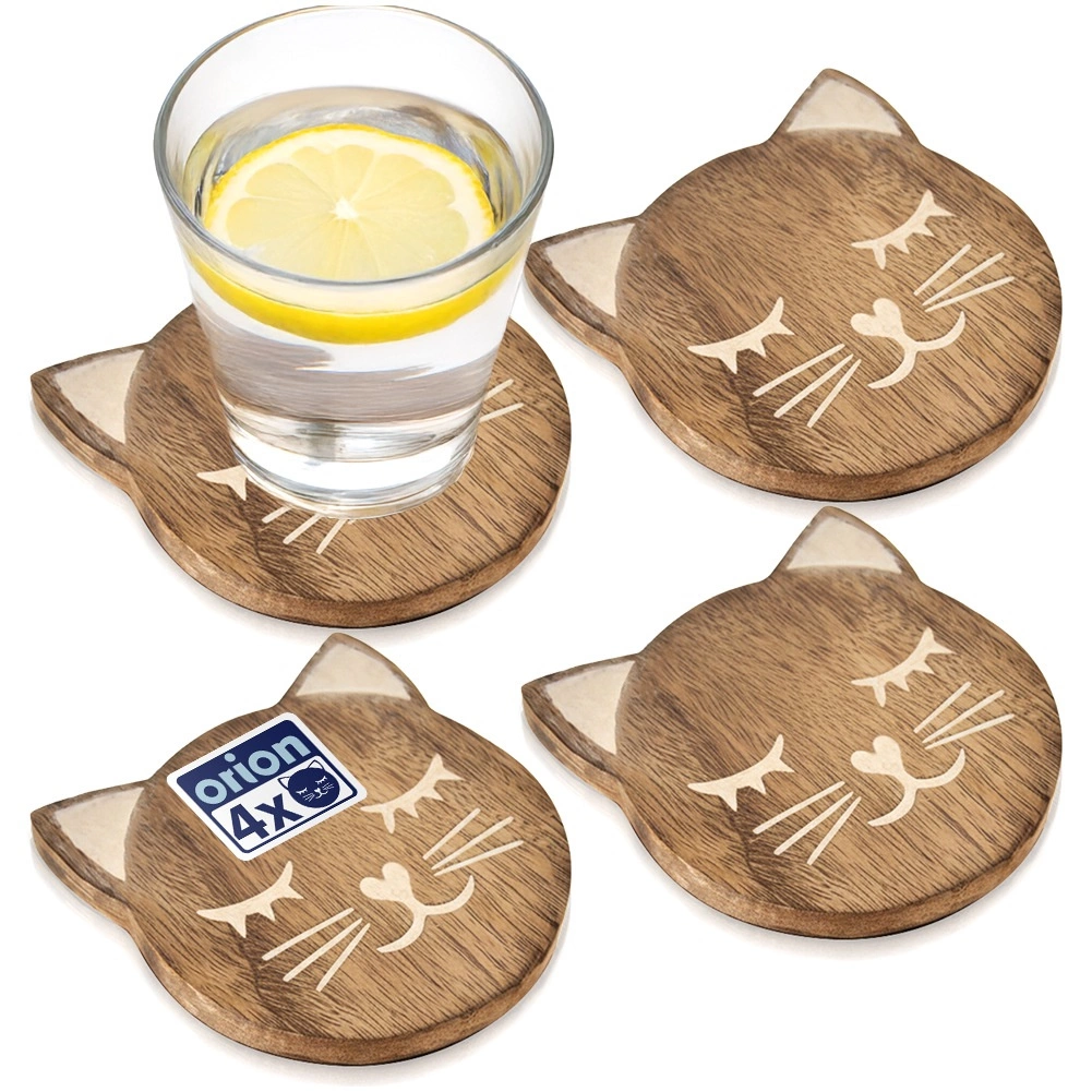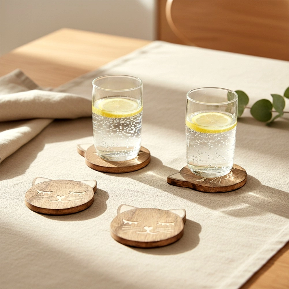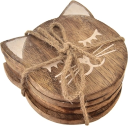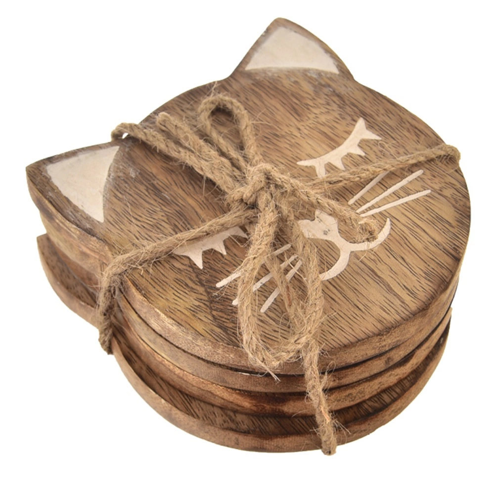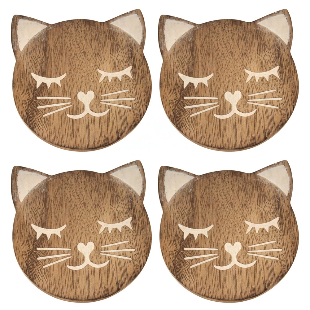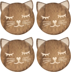 Adorable lot de quatre dessous de verre en bois de manguier avec motif de tête de chat, protégeant la table de la chaleur et de l’humidité tout en embellissant chaque table. Bois naturel, usage universel pour tasses, verres et mugs, et design félin stylé en font un excellent accessoire et une idée cadeau pour les amoureux des chats.