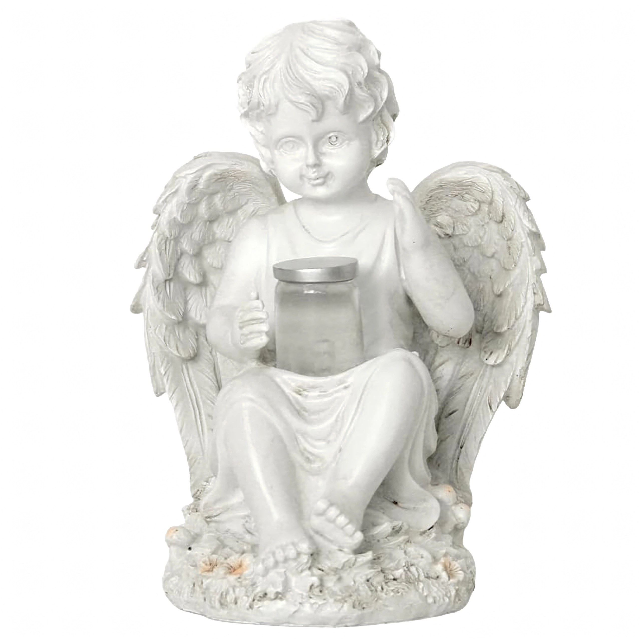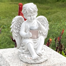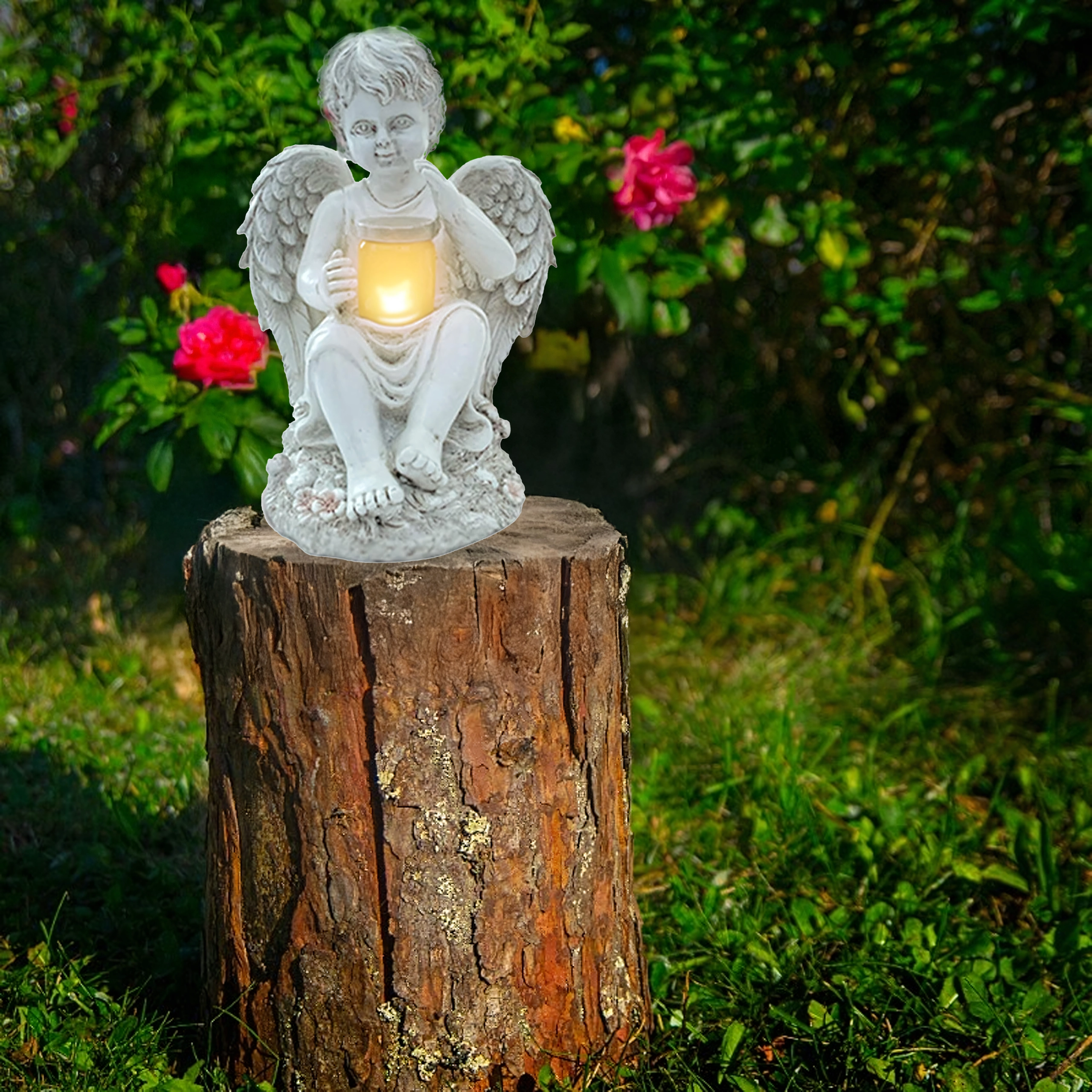 Une lumière douce et chaude dans la coupelle tenue par l’ange crée une ambiance du soir apaisante au jardin ou près d’un mémorial.