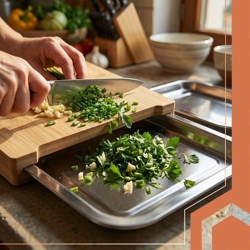 La pratique planche en bambou RUHHY avec deux bacs coulissants en acier inoxydable rend la préparation des repas plus agréable. Elle offre une grande surface de travail de 40 × 28,5 cm, une organisation rapide des ingrédients sans désordre et un bambou durable et hygiénique. Les bacs sont résistants à la chaleur, peuvent être utilisés au four et lavés au lave-vaisselle – idéal pour une cuisine rapide à la maison comme en restauration.
