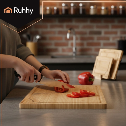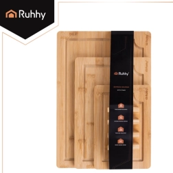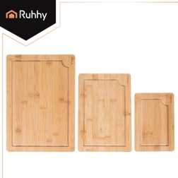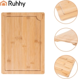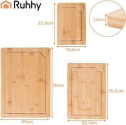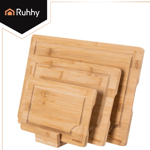Ensemble pratique de trois planches en bambou RUHHY de tailles différentes avec un support robuste pour un rangement organisé. Le bambou naturel est résistant et hygiénique, doux pour le fil des couteaux et sèche rapidement. Des gorges intégrées pour l’écoulement des jus aident à garder l’ordre lors de la découpe de la viande, des légumes et des fruits. Idéal dans toute cuisine pour couper et servir.