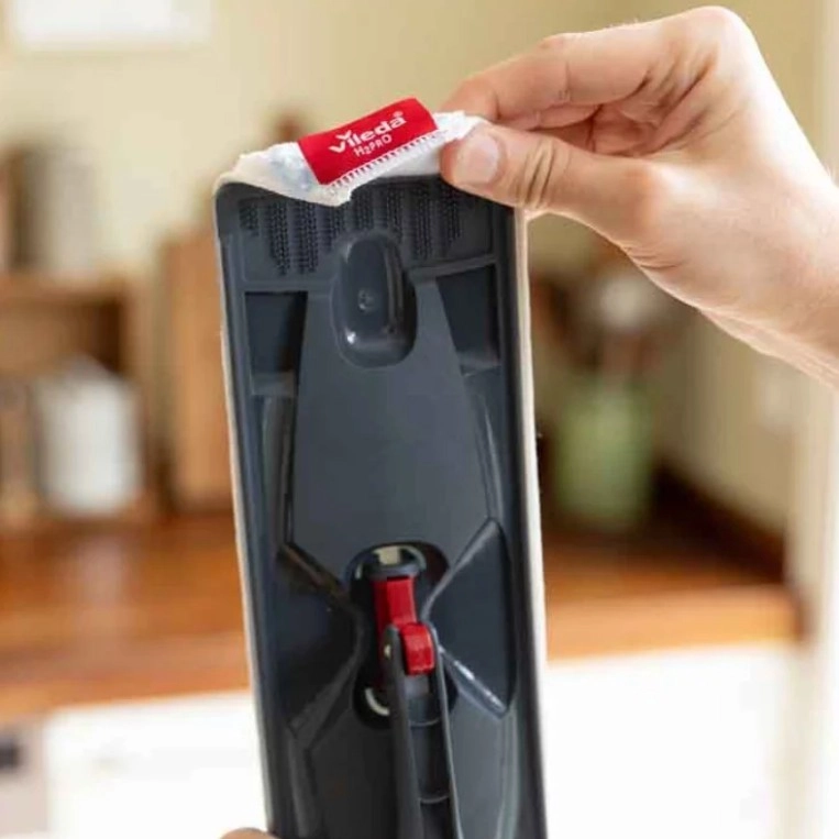 La housse se fixe facilement sur la base du balai et reste bien en place pendant le nettoyage. Compatible exclusivement avec le balai Vileda H2Pro.