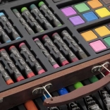 Set artistique complet dans une élégante mallette en bois pour artistes débutants comme confirmés. Il comprend un large choix d’outils pour le dessin et la peinture afin de donner vie à vos idées. Vous y trouverez des peintures acryliques, des peintures aquarelles, des pastels secs et à l’huile, des crayons de couleur et à mine, des pinceaux et d’autres essentiels – le tout rangé de manière claire et facile à transporter.