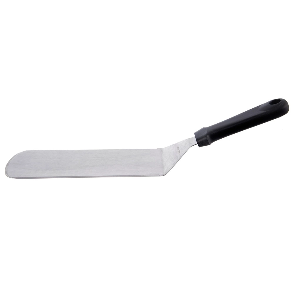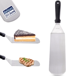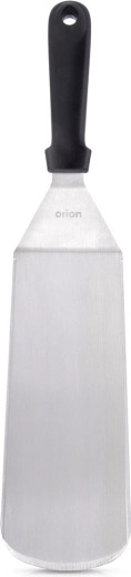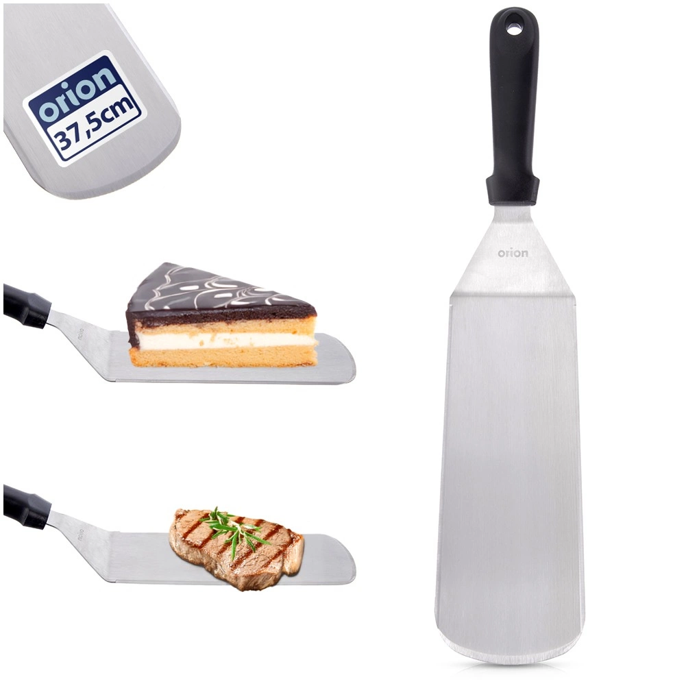 Spatule de cuisine universelle en acier inoxydable de 38 cm pour soulever et retourner les aliments en toute facilité. Elle possède une large surface de travail, des bords tranchants pour la découpe, une poignée ergonomique et est compatible lave-vaisselle. Idéale pour crêpes, poissons, omelettes, lasagnes et burgers.