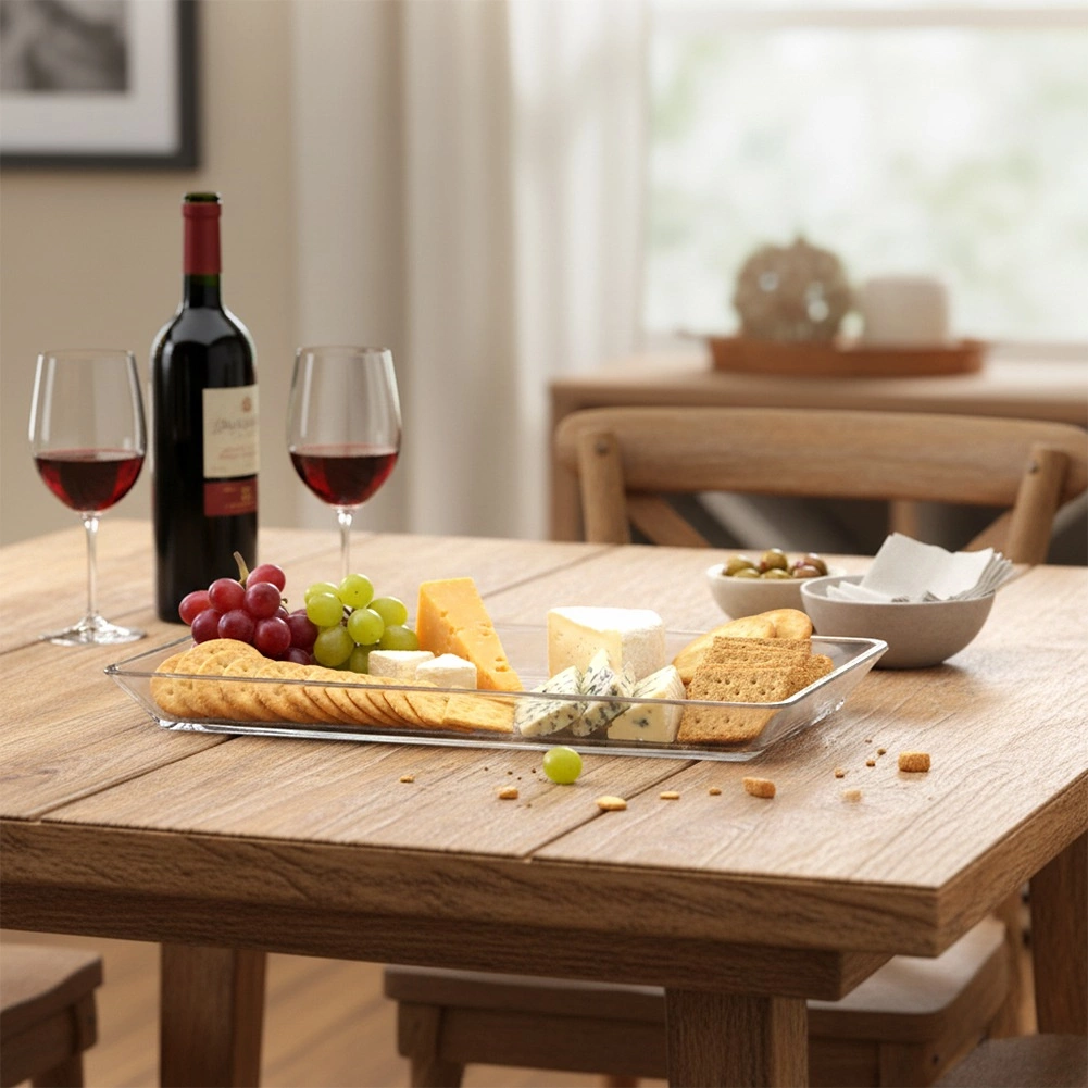 La transparence met en valeur les couleurs et la texture des mets, tandis que la surface lisse apporte une touche moderne à la table.