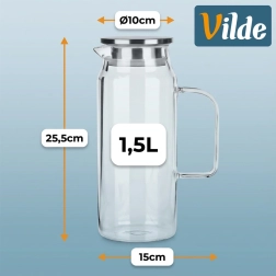 Le verre borosilicaté résistant est léger, solide et convient aux boissons froides comme chaudes. L’anse ergonomique et le bec verseur profilé assurent un service confortable et précis sans gouttes. Grâce au joint du couvercle, les boissons restent propres et protégées, par exemple contre les insectes à l’extérieur.