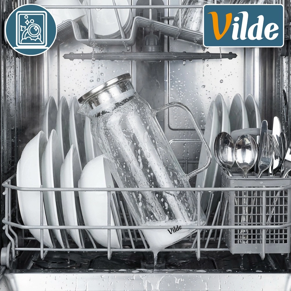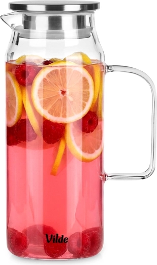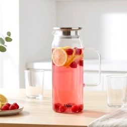 Cette carafe en verre stylée est idéale pour le service quotidien de l’eau, de la limonade, des jus et du thé glacé. Grâce au verre transparent, les tranches de fruits et les herbes ressortent joliment, tandis que le couvercle en inox avec filtre les maintient à l’intérieur. Parfaite pour la table familiale, les repas au jardin ou les réceptions du soir.