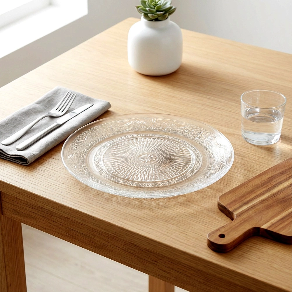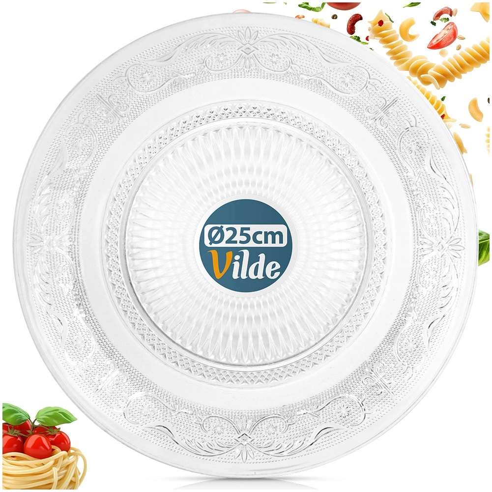 Assiette en verre élégante de 25 cm de diamètre avec un décor en relief rappelant le cristal. Polyvalente et pratique pour le quotidien comme pour les occasions. Peut être utilisée comme assiette peu profonde ou comme plateau pour desserts et amuse-bouches. Compatible lave-vaisselle, verre transparent de qualité, design classique et utilisation polyvalente à la maison comme en restauration.