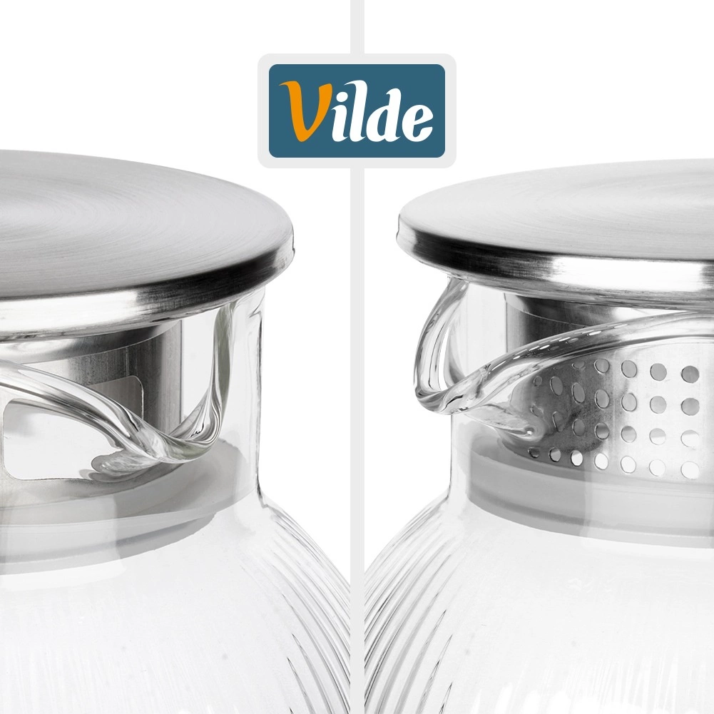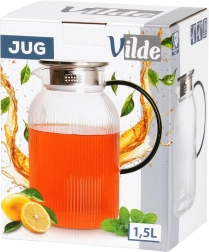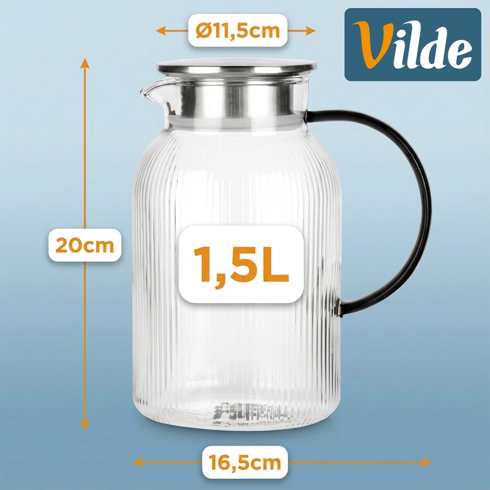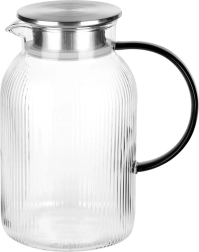 Carafe stylée pour eau, limonade ou thé glacé, alliant look moderne et fonctionnalité. Le verre transparent rainuré met en valeur la couleur des boissons, tandis que le couvercle en inox à teinte dorée protège le contenu et permet un service pratique à l’abri des impuretés.