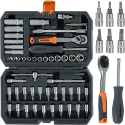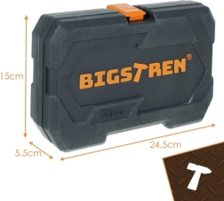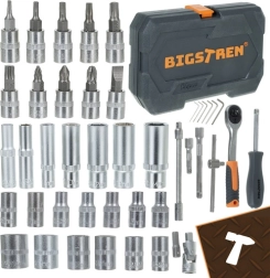 Le set d’outils universel BIGSTREN dans une mallette pratique comprend 56 pièces pour l’entretien, l’atelier et l’automobile. Il contient des douilles 1/4", des embouts, des douilles profondes et standard, des rallonges ainsi qu’un cliquet 72T. Les pièces en acier chrome-vanadium (CrV) garantissent une grande résistance et une longue durée de vie.