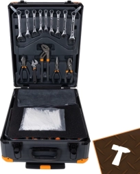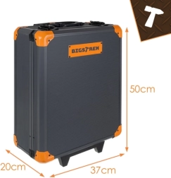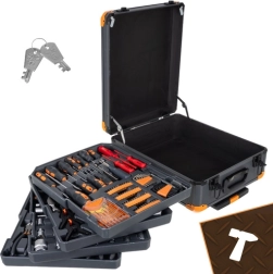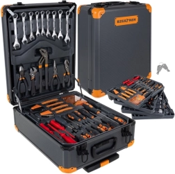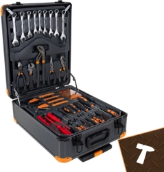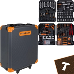 Le contenu du set comprend entre autres : clés plates, cliquets 1/2" et 1/4" (72T), jeux de douilles, tournevis y compris de précision, embouts avec porte-embouts, clés hexagonales, pinces, marteau, couteau, mètre, niveau à bulle, serre-joints, accessoires de montage et d’autres compléments pratiques.