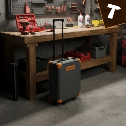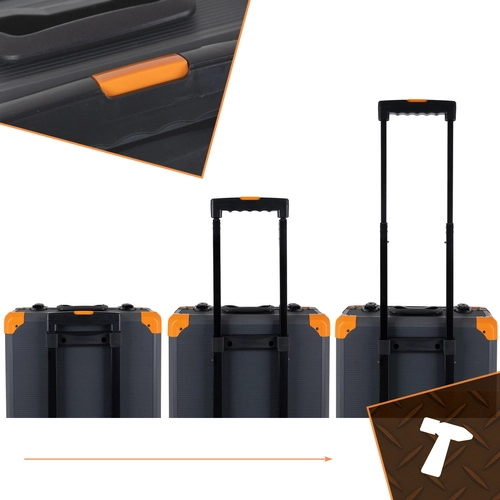 Mallette en aluminium robuste avec poignée réglable, roulettes et coins renforcés pour un transport confortable et sécurisé de l’ensemble, à la maison, au garage ou en déplacement.