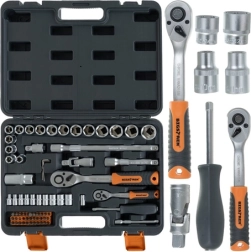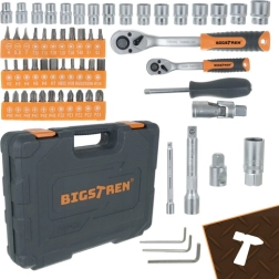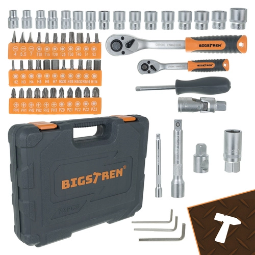 Coffret d’outillage universel BIGSTREN 72 pièces dans une mallette robuste pour l’atelier, la maison et la voiture. Comprend des cliquets 1/4" et 1/2" à fine denture 72T, une large gamme de douilles, embouts et rallonges en alliage CrV pour une longue durée de vie. La mallette pratique assure ordre, visibilité et transport facile.