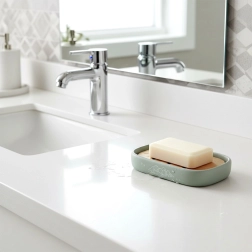 Le porte-savon élégant GREENISH maintient l’ordre près du lavabo et garde votre savon toujours au sec. Il combine une pierre synthétique résistante de couleur menthe avec un insert en bambou pour l’évacuation de l’eau. Grâce à ses dimensions pratiques 13 × 9 × 2 cm, il convient à toute salle de bain, toilette ou cuisine. Facile à nettoyer, il s’accorde parfaitement aux intérieurs modernes comme classiques.