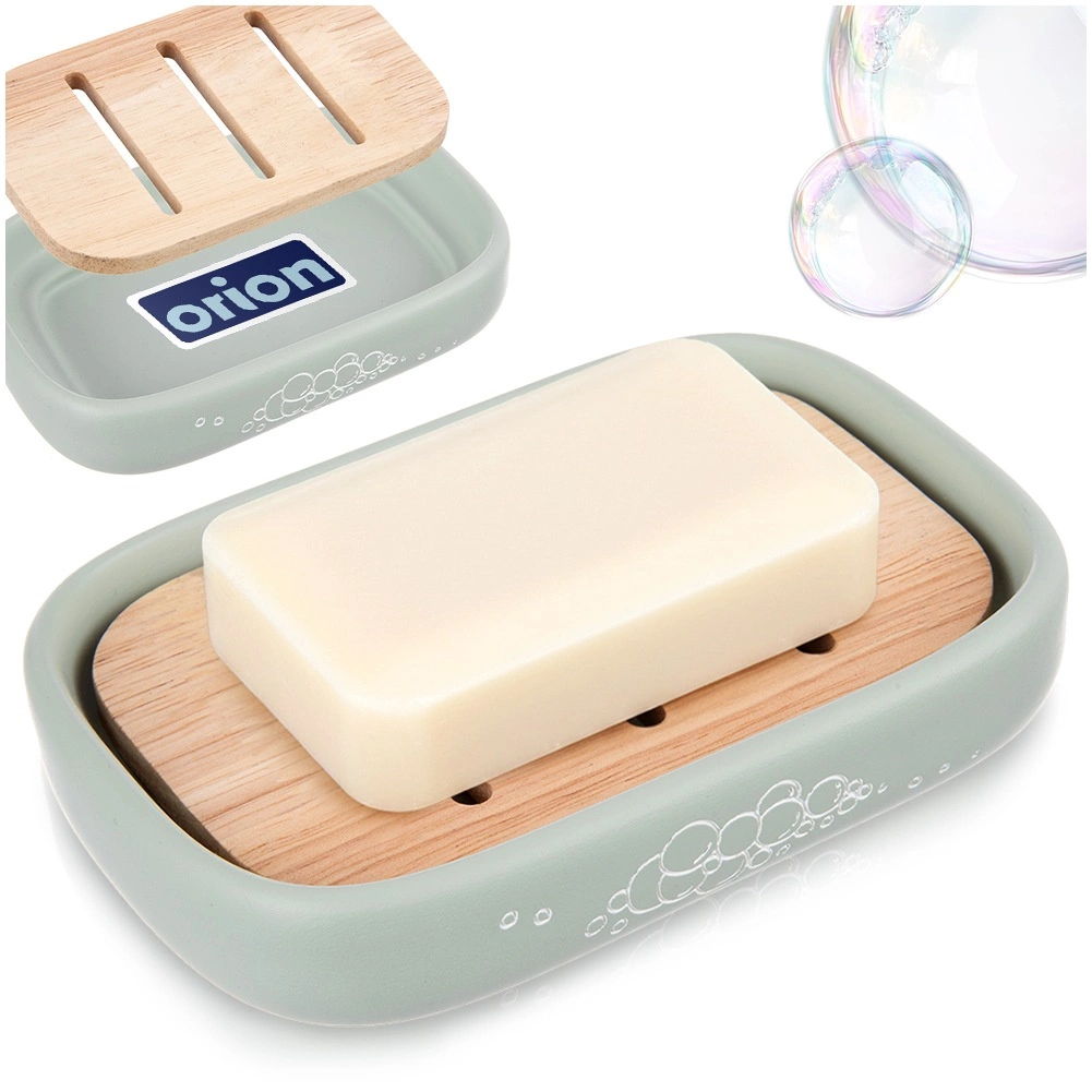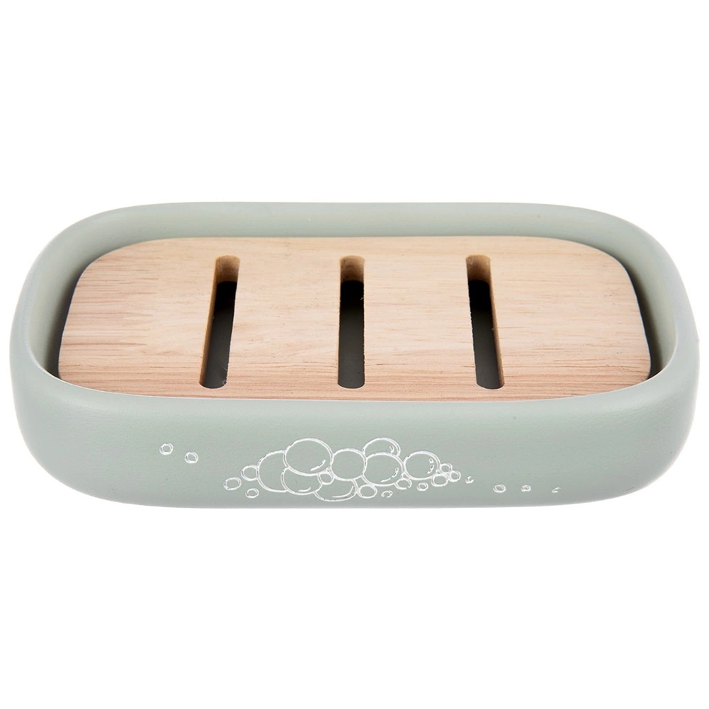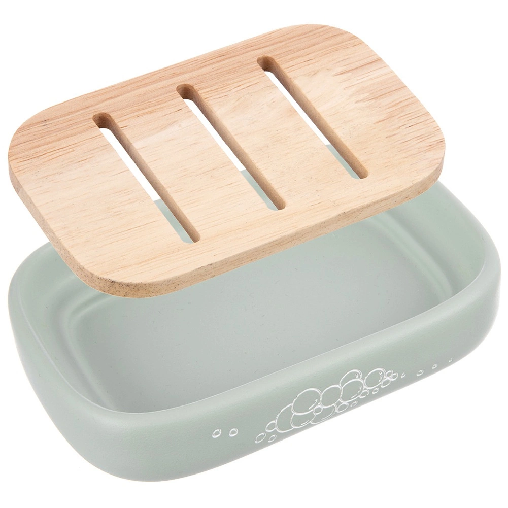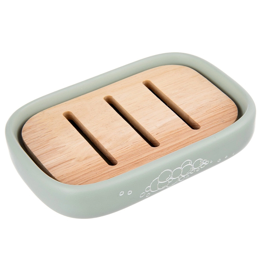 Le porte-savon minimaliste GREENISH est un accessoire stylé et fonctionnel pour un usage quotidien. Le corps en pierre synthétique résistante, couleur menthe, imite la céramique, tandis que l’insert en bambou amovible surélève le savon et permet l’écoulement de l’eau afin qu’il ne ramollisse pas.