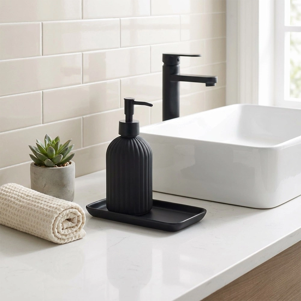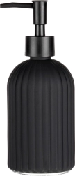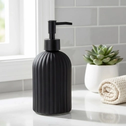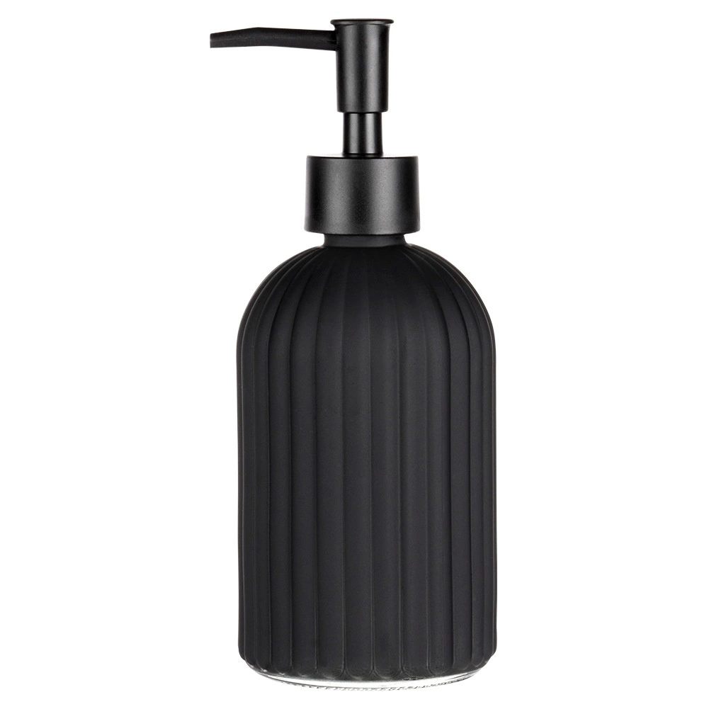 Ce distributeur de savon en verre de qualité, en noir mat, est un accessoire à la fois pratique et décoratif pour votre salle de bain ou votre cuisine. Sa surface texturée et rainurée assure une prise en main sûre et une bonne résistance, tandis que ses lignes épurées soulignent le caractère contemporain de l’intérieur.