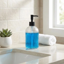 Distributeur stylé et pratique en verre clair rainuré, apportant ordre et esthétique à la routine quotidienne. Grâce au corps transparent, vous avez un aperçu immédiat de la quantité de produit, tandis que la pompe noire de qualité garantit un dosage précis et contrôlé. La capacité de 400 ml est idéale pour le savon liquide, le gel pour les mains et le liquide vaisselle.