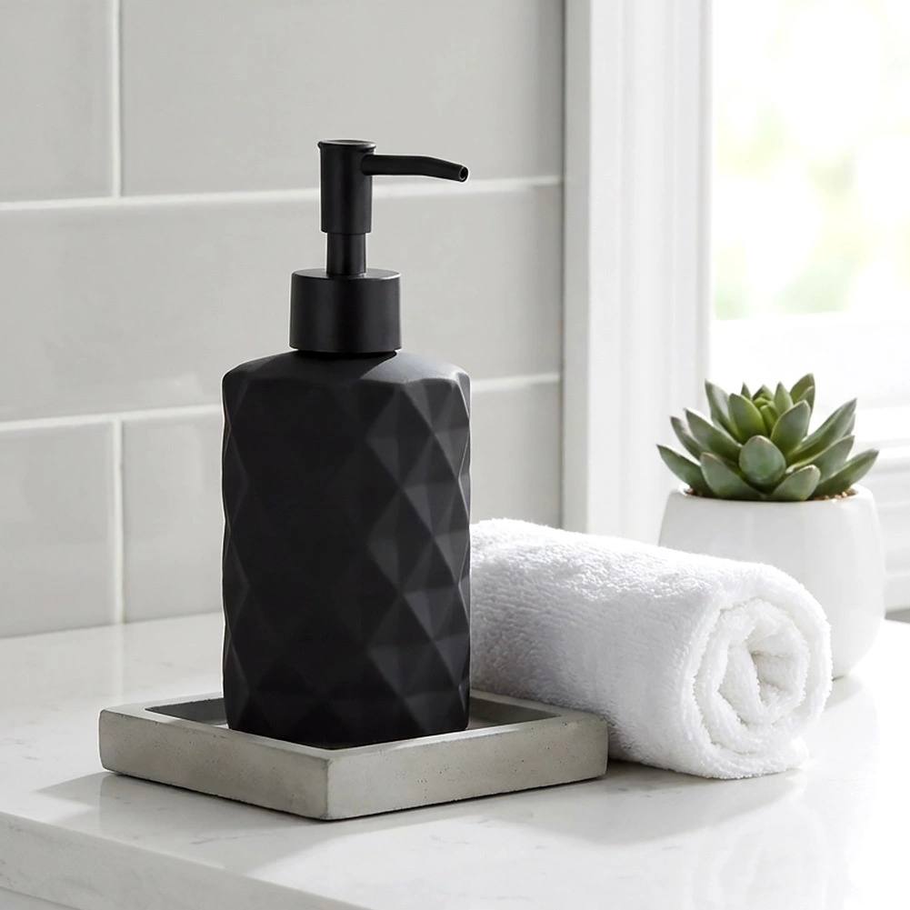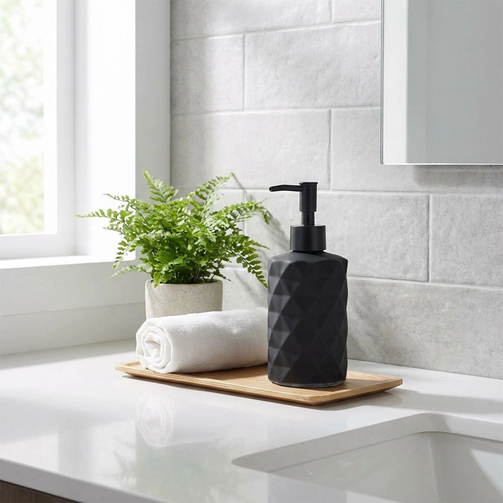 Le distributeur de savon en verre de couleur noire mate allie esthétique et fonctionnalité. Le verre décoratif translucide permet de contrôler le niveau de remplissage, tandis que la pompe résistante assure un débit fluide. Idéal pour savon liquide, désinfectant ou liquide vaisselle.