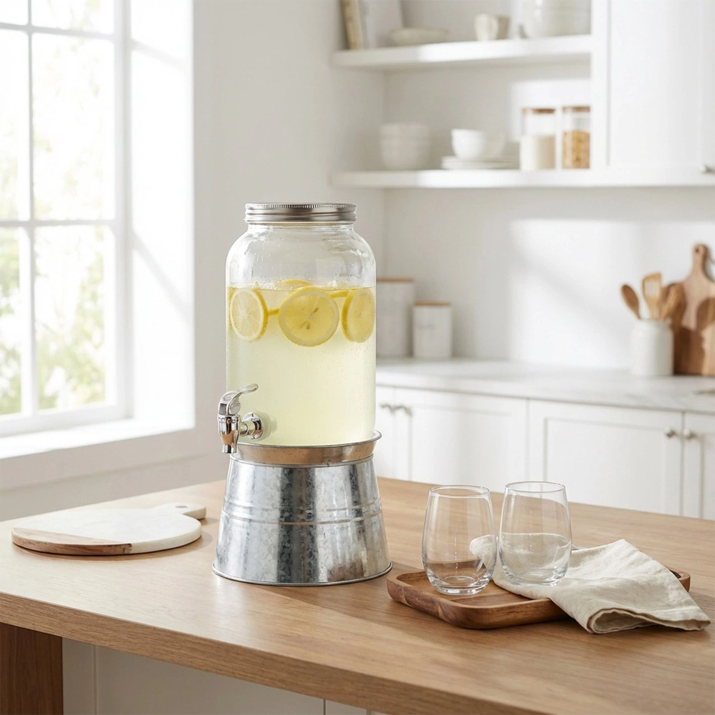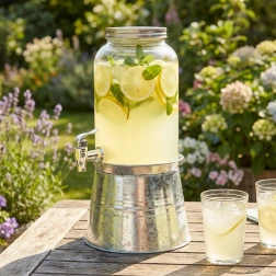 Le distributeur est fabriqué en verre épais de qualité au toucher lisse, et le robinet permet un versement fluide et propre. Parfait pour les fêtes au jardin, barbecues, réunions de famille, ainsi que pour les cafés et bars, où il mettra en valeur avec style limonades, thé glacé ou eaux fruitées.