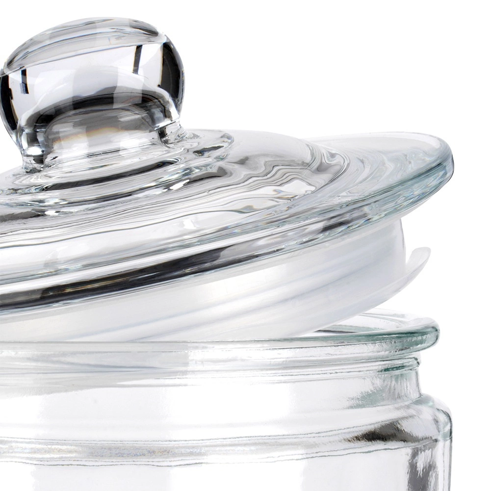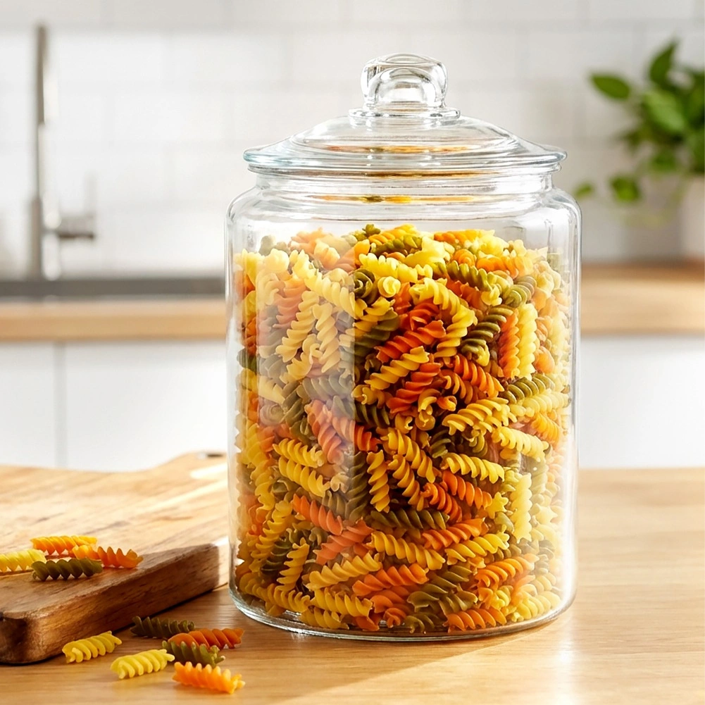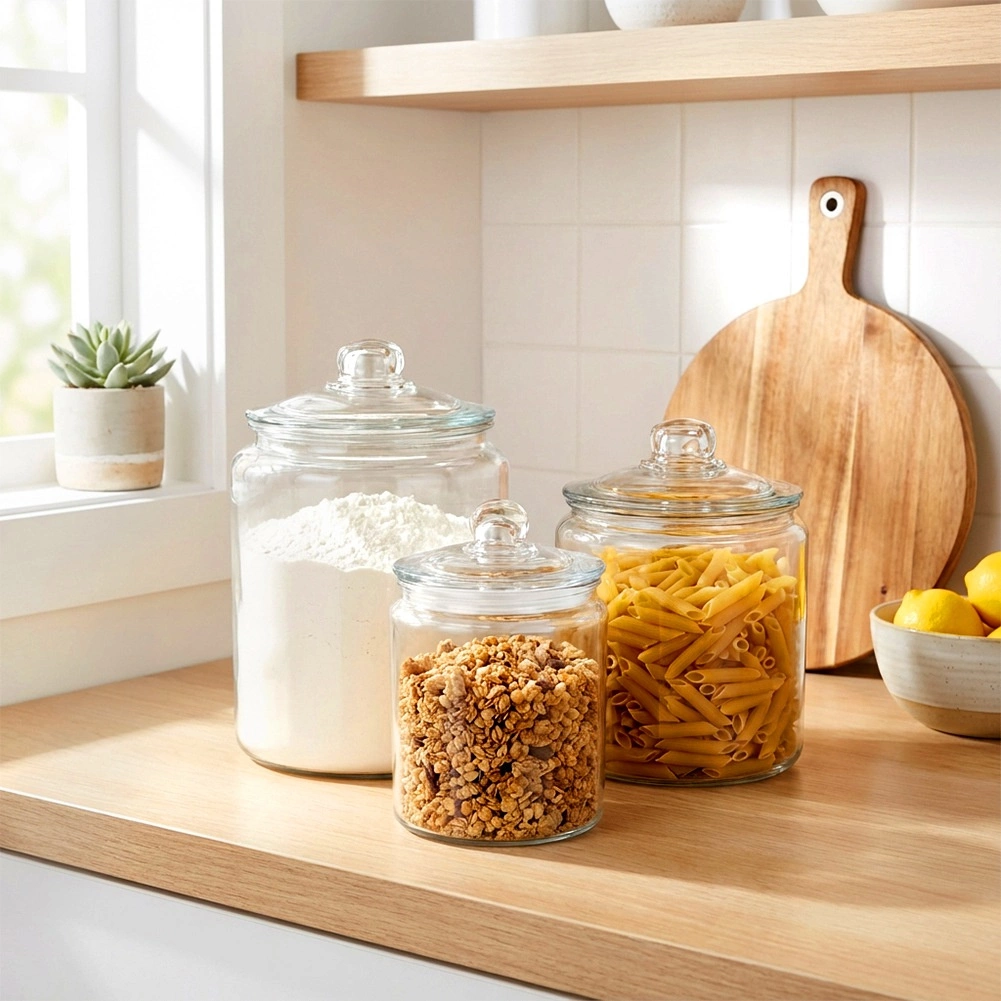 Le verre clair et résistant permet de vérifier instantanément l’état des réserves et met joliment en valeur pâtes, farine ou biscuits sur le plan de travail.