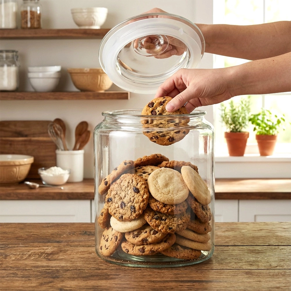 Le couvercle avec joint transparent assure une étanchéité fiable, empêchant l’humidité de pénétrer et la perte d’arômes – idéal pour le café, le thé et les biscuits.