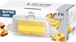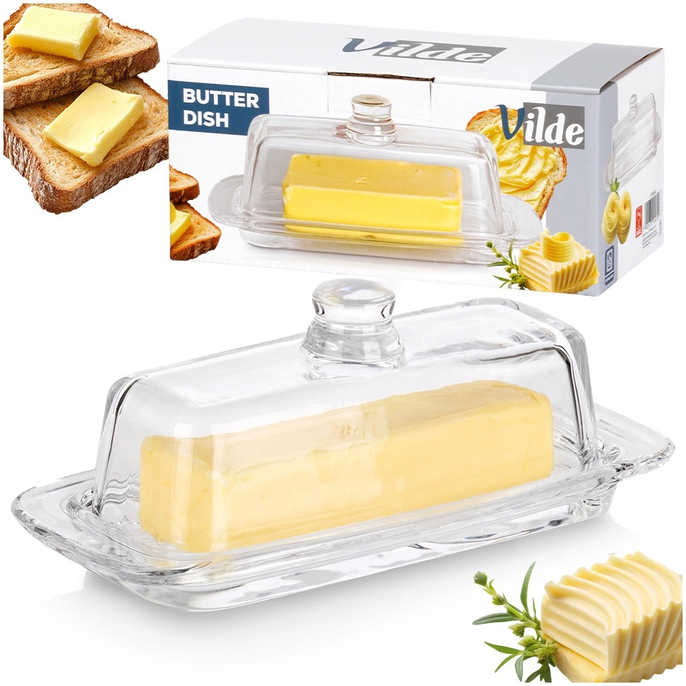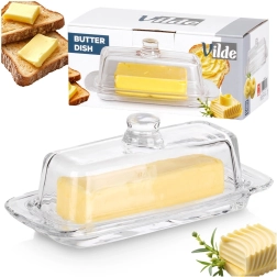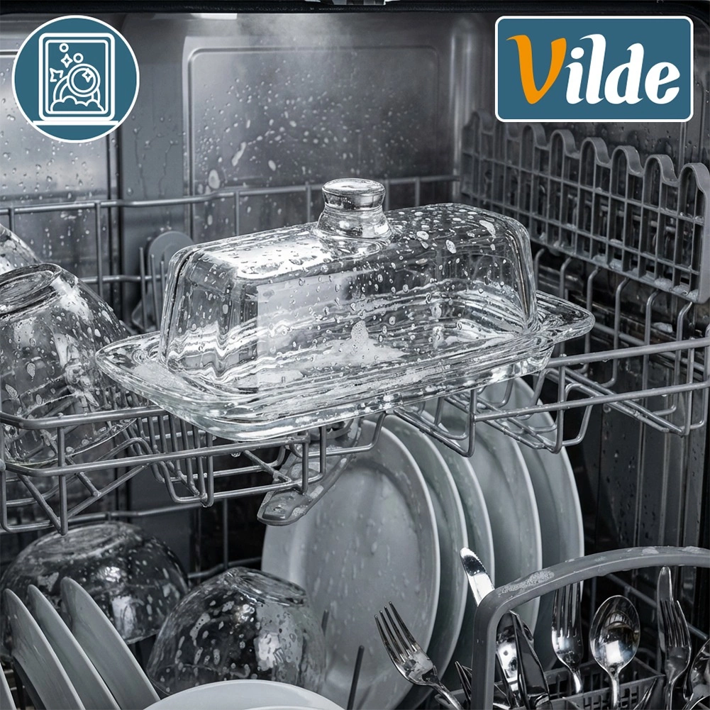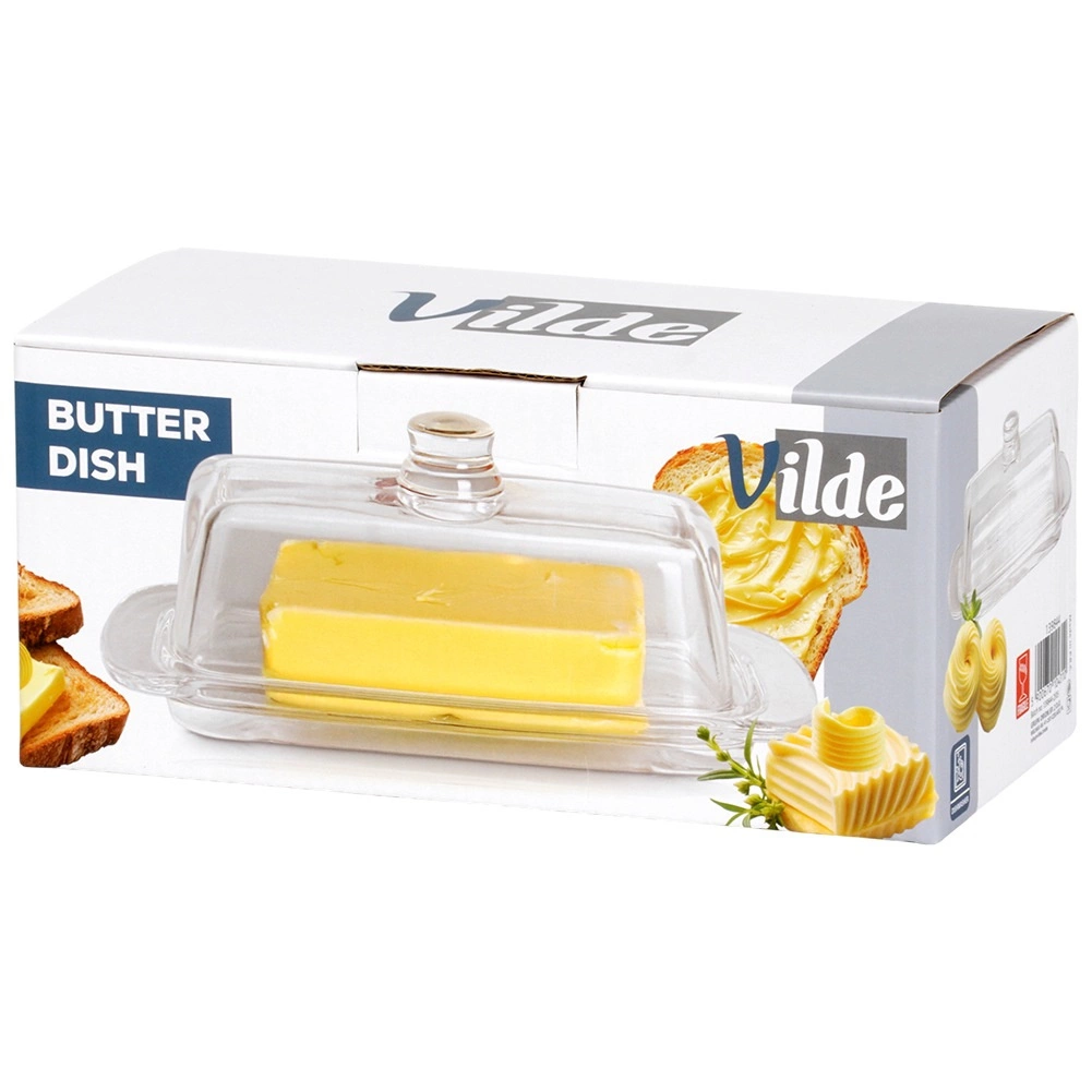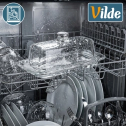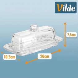 Le beurrier en verre VILDE, au style soigné, est idéal pour un usage quotidien – du réfrigérateur à la table. Sa transparence permet de contrôler facilement la quantité de beurre, et la cloche élégante avec poignée assure une utilisation confortable. Sa forme classique s’harmonise avec tout service de table et fait du beurre un élément attrayant du service.