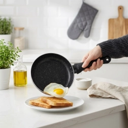La poêle stylée et durable de la ligne Black Line est fabriquée en aluminium coulé de qualité avec un revêtement de surface en granite antiadhésif. Grâce à sa forme plus profonde, elle est idéale pour frire comme pour mijoter – des œufs à la viande juteuse en passant par des légumes croquants. Le revêtement antiadhésif permet de cuisiner avec un minimum d’huile et facilite grandement le nettoyage.
