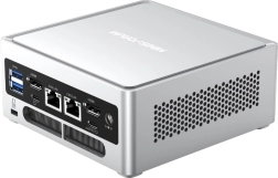 Le mini PC offre une connectivité étendue incluant USB‑C, quatre USB‑A, deux HDMI, deux ports Ethernet 2,5G et une prise audio 3,5 mm. Il prend en charge les configurations multi‑moniteurs jusqu’en 4K et peut être facilement fixé derrière l’écran via VESA. Le refroidissement optimisé avec deux heatpipes, double extraction et refroidissement SSD actif assure des performances stables même lors de charges prolongées.